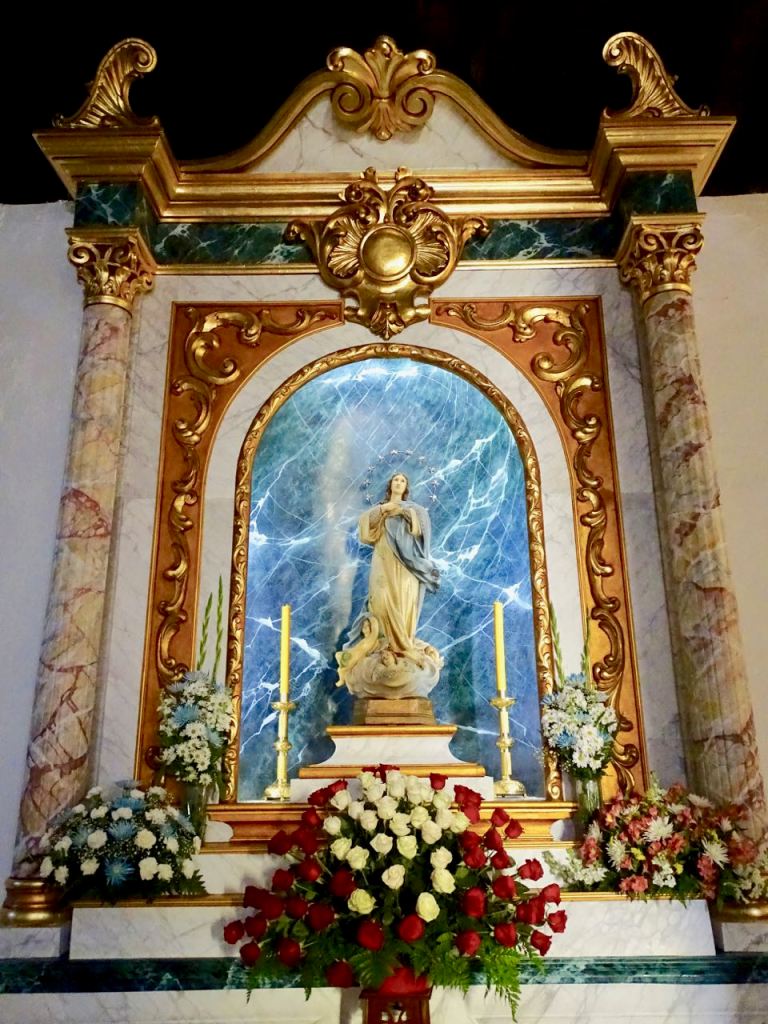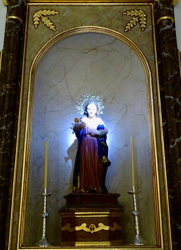 Kuvataiteessa (lähteenä Wikipedia) Marian perisynnitöntä sikiämistä kuvataan yleensä kirkastuneena naisen hahmona tai taivaallisena hahmona, jota ympäröivät enkelit, kukat, pilvet tai tähdet. Synnitön sikiäminen kuvataan siten että Maria on juuri luotu, ja hänen henkensä katsoo nuoren naisen hahmossa Jumalaan. Tällaisen viattoman hahmon näimme tänään Toloxin katolisessa kirkossa. Viaton Maria katsoo viattomana ruusua kädessään.