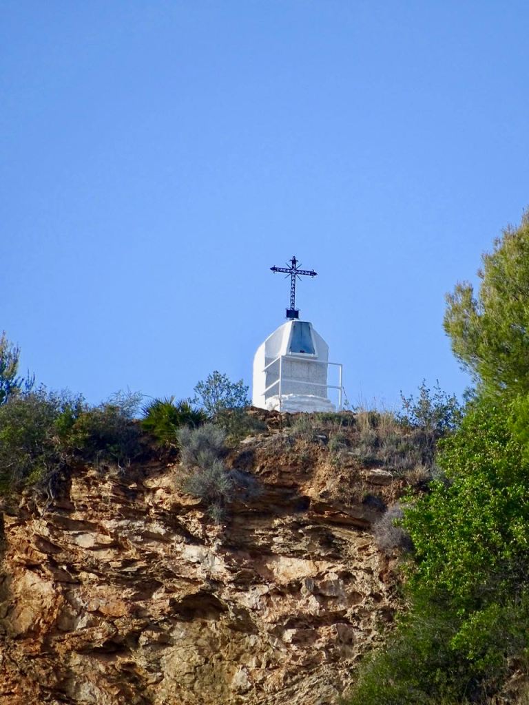 Katselin kylän yli rinteelle ja mietin, etsisinkö seuraavaksi kerraksi jonkun reitin kiivetä ylös. Jossain tuolla kaukana ylhäällä näkyi valkoinen pieni rakennelma.