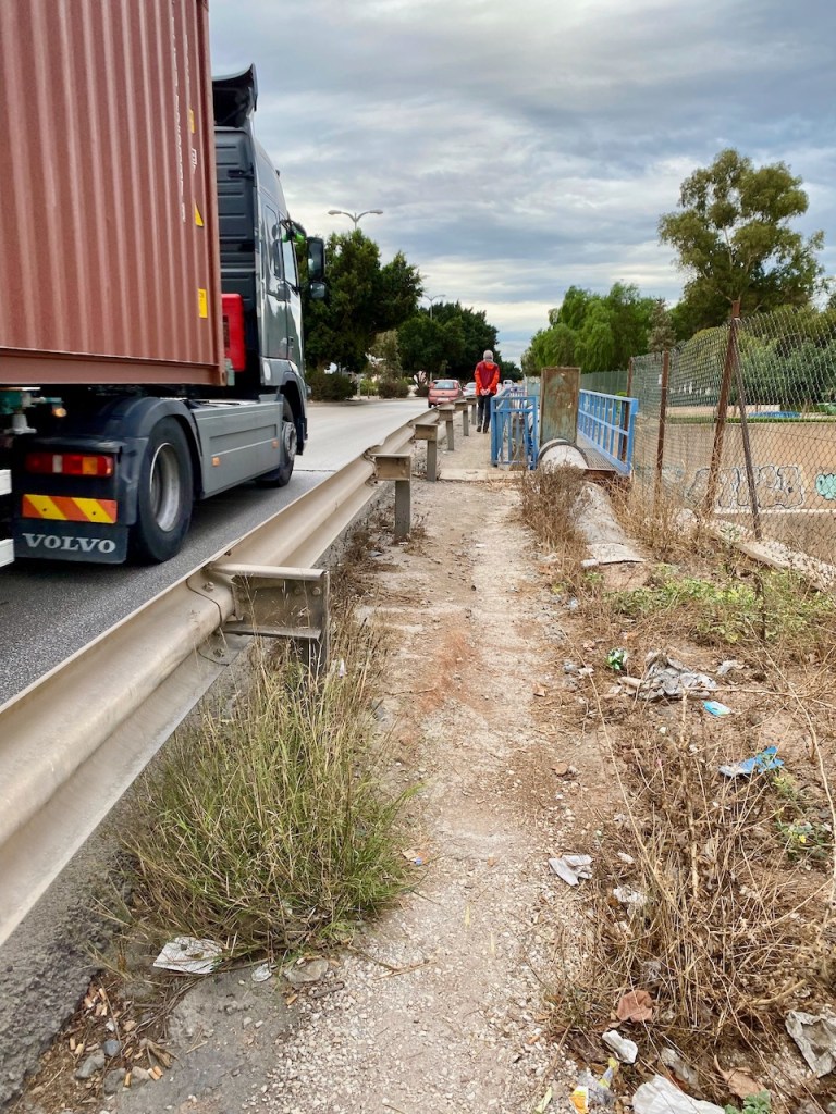 Ei tämä mitään kivaa käveltävää ollutkaan. Kapea jalkakäytävä vilkkaalla tiellä.