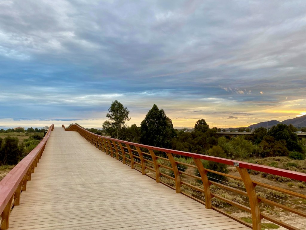 Kyllä tänne kannatti tulla. Lääninvaltuusto ja pääkaupungin kaupunginvaltuusto ovat investoineet 1,6 miljoonaa euroa siltaan ja muihin jokisuun ympäristöä parantaviin toimenpiteisiin Rakenteessa on käytetty yli 200 tonnia skandinaavista alkuperää olevaa mäntyä ja lähes 15 tonnia meriympäristöön sopivaa ruostumatonta terästä. Tästä tulee Senda Litoralin tärkein maamerkki. 270 metriä pitkä ja kolme metriä leveä rakennelma on kyllä mukava suorittaa kävellen. Ei ollut tungosta ja polkupyöräilyä oli rajoitettu selvästi, heidän piti antaa etusija kävelijöille ja nopeusrajoitus oli 10km/t