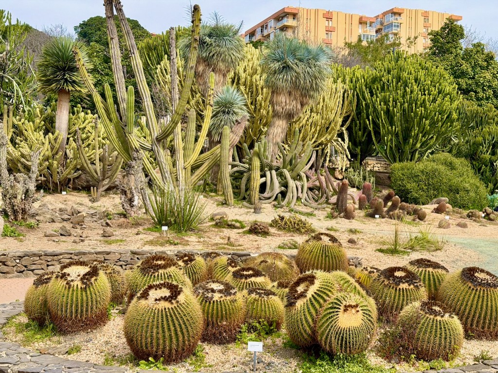 Ja puiston nurkassa sijaitsevan kaktuspuiston kaktukset ovat aivan uskomattoman suuria. Lähes yhtä korkeita kuin takana kasvavat palmut. Meidän kuvamme ovat kevättalvelta, myöhemmin täällä on varmaan kukkiviakin kaktuksia.