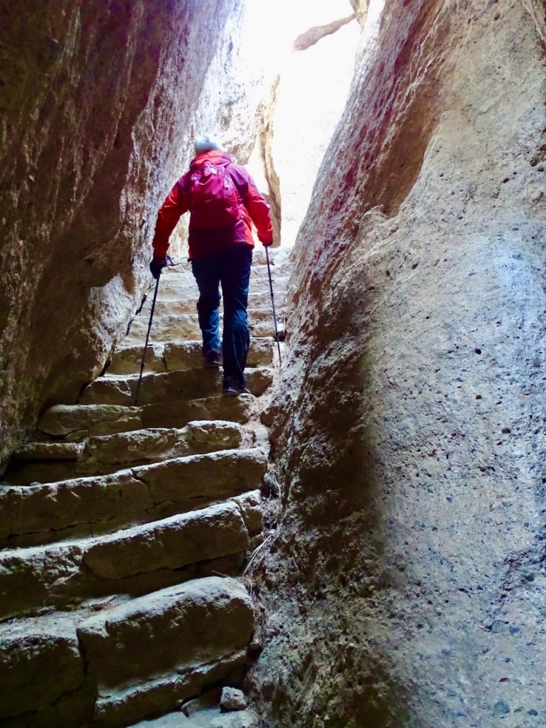 Reitti ei ole pitkä, reilut kolme kilometriä ylös, mutta meiltä kuluu ylös menoon helposti pari tuntia leppoisasti edeten. Itse asiassa nyt kului jo 2,5 tuntia. (Vanhuus tulee?) Tosin oli helle ja teki mieli pitää pikku taukoja useammin kuin ennen. Vaikeita kohtia polulla ei ole, mutta kaikissa reittikuvauksissa olen nähnyt nämä ainoat portaat kallion läpi reitin alkupäässä. Kallio näyttää seinältä.