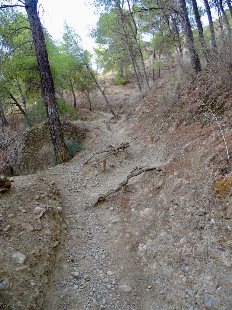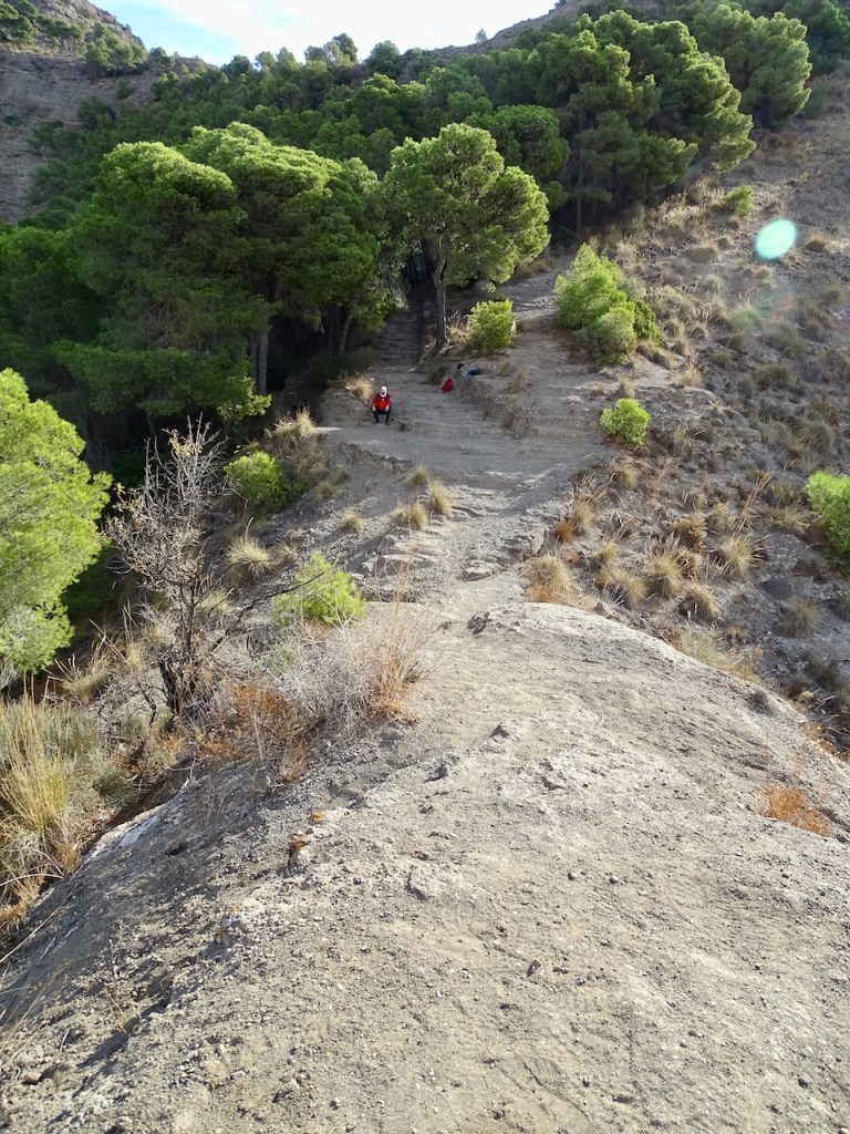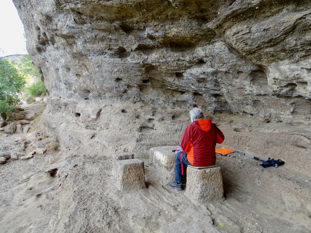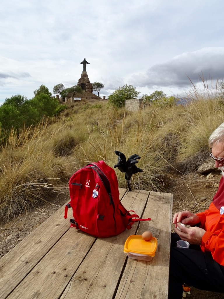 Sitten katoimme pöydälle eväät repusta ja lähdimme alas. Omat eväät siis mukaan, täällä ei mitään palveluja ole. Ei vessaa, ei kahvilaa. Grillipaikka on. Ja näitä pöytiä. Voi tietysti olla, että asia on vähän toisin kesäkuukausina, jospa silloin on väkeä enemmän. Me näimme retkellämme tänäänkin neljä kävelijää ja yhden pähkähullun pyöräilijän. Hänen vauhtinsa alas oli kapealla polulla niin hurja, että palautin jo mieleen, mitä hätäpuhelussa selittäisin espanjaksi, jos näkisin tuon pojan kaatuneena jossain rinteellä. Onneksi en nähnyt, vaikka pyörän jäljet hiekassa näinkin. Näimme viimeksi myös auton ja kysyimme kuskilta, miten tänne voi autolla ajaa. Hän selitti espanjaksi, että pitää sietää pomppimista ja hidasta etenemistä, eli ei mikään hyvä juttu. Mutta siis mahdollinen.