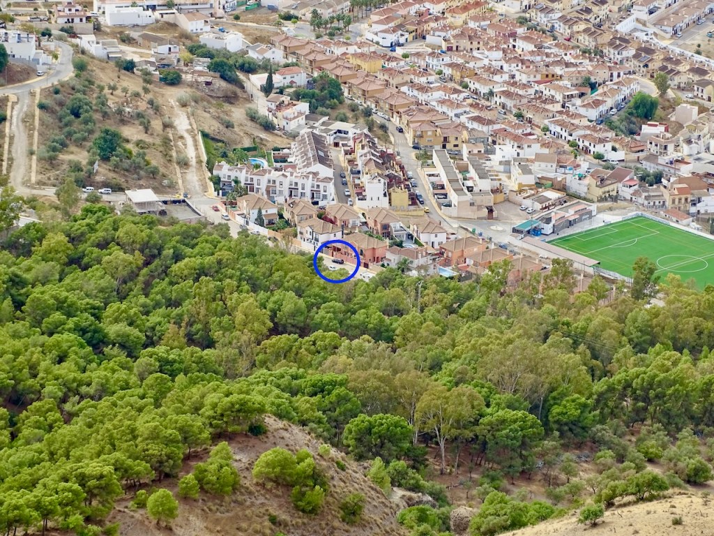 Otin myös sellaisen kuvan Pizarrasta, jossa näkyy tuon sinisen ympyrän sisällä meidän musta auto. Tuo jalkapallostadionin vieressä oleva parkkipaikka on paras mahdollinen lähtöpaikka rinteelle Raja Anchan virkistysalueen läpi. Pizarraan voi tulla kyllä junallakin, jolloin tähän Raja Anchan virkistysalueen viereen on jo jonkin verran katujen kautta kiipeämistä. Onhan kaupunki toisaalta ihan nätti pieni valkoinen kylä sekin.
