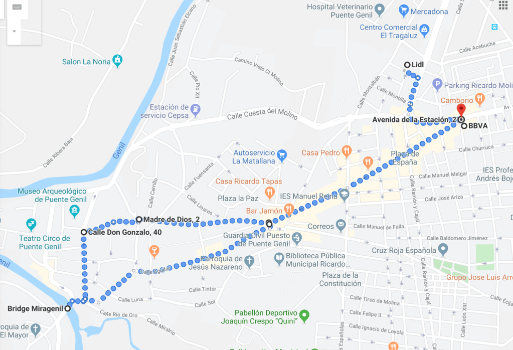 Puente Genil on noin 120 kilometriä rannikolta suunnilleen Gordoban suuntaan. Suunnilleen tällaisen reitin kävelimme siellä joka kerta käydessämme.
