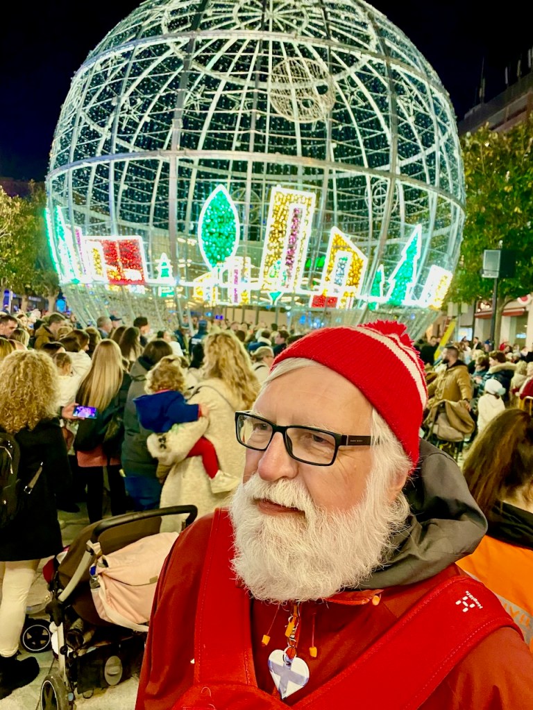 Vielä pikkuinen hauskuus tästä vierailustamme. Kudoin Juhalle punaisen pipon, että hänet olisi helpompi tunnistaa kulkiessamme jouluvalaistuja katuja. Kyllä tunnistettiinkin. Yksi jos toinen tervehti hymyillen: ”Papá Noel!” Juha vastasi ”Feliz Navidad” ja minä kerroin, että tämä Papá Noel on oikeasti ”de Finlandia” ja tarjosin tervehtijöille Fazerin Geishakarkin. ”Chocolate de Finlandia.” Tämä leikkiminen toi hauskoja kontakteja ja tapaamishetkiä iltaamme. Erityisen hauska oli parinkymmenen totnttulakkeihin pukeutuneen naisen ryhmä, joka halusi ottaa ryhmäkuvan aidon suomalaisen joulupukin kanssa ja toivotteli meille sen jälkeen iloisesti hyvää joulua. (Alla oleva kuva on kylläkin Torremolinosin jouluvalojuhlasta, jossa samat selfiekuviot olivat mukana myös.)