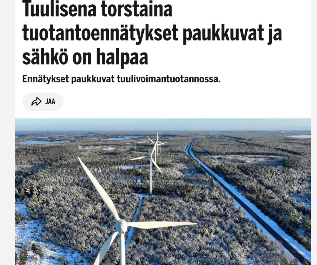Uutiset hehkuttivat energiakriisin keskellä ennätyspäivää tuulienergian tuottamisesta. Hieno uutinen, Suomi pärjää kyllä.
