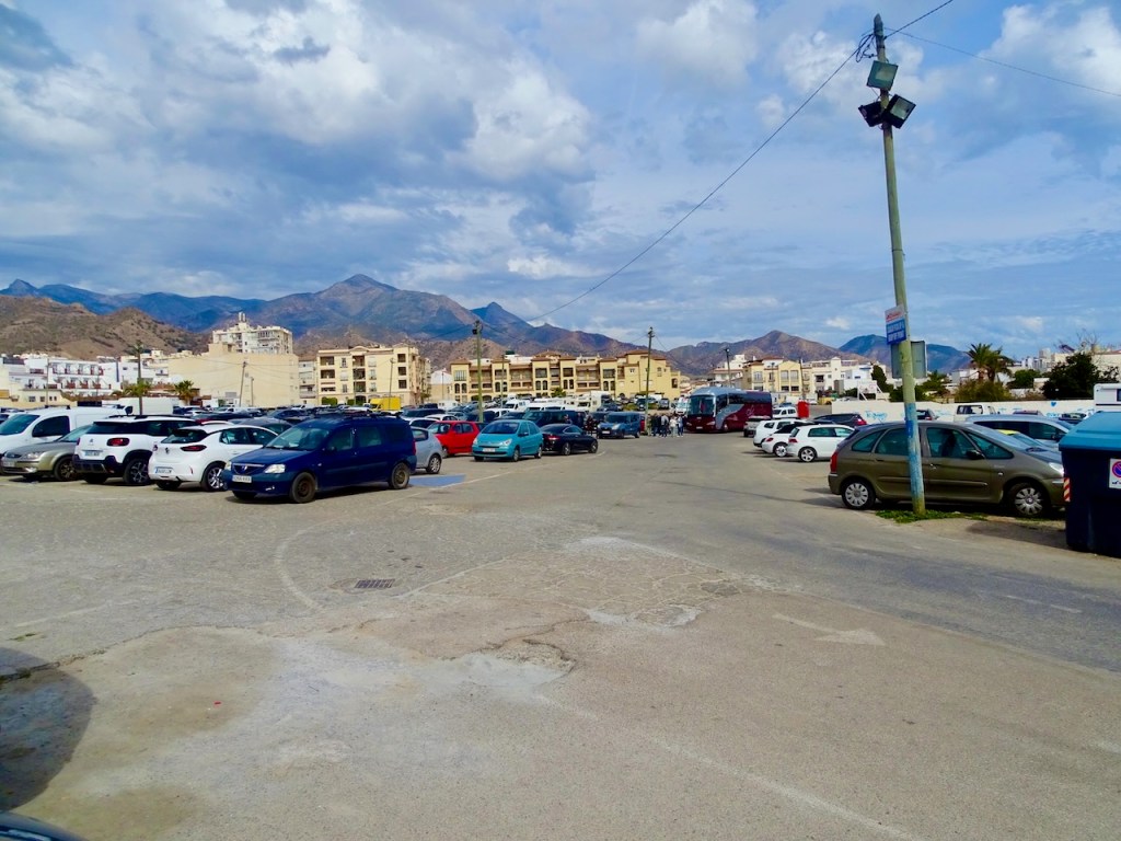 Nerjan kaunein keskusta ja keskeisimmät nähtävyydet löytyvät helposti, kun seuraa Parador-parkkialueen viitoitusta, jättää auton sinne ja suunnistaa lähikaduille. Viimeksi täällä käydessämme (2018) paikka oli maksullinen, mutta nyt (helmikuussa 2023) emme löytäneet mitään tietoa maksusta tai paikkaa maksaa. Autoja oli paljon, mutta paikka on iso, joten tilaa oli kyllä.