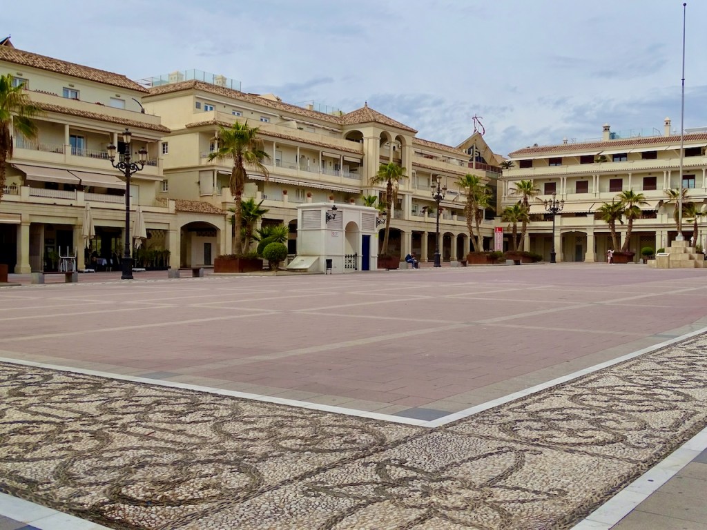Plaza Espanja on laaja ja näyttävän näköinen. Sen reunoilla on terasseja, joilla voi istua ja nauttia.