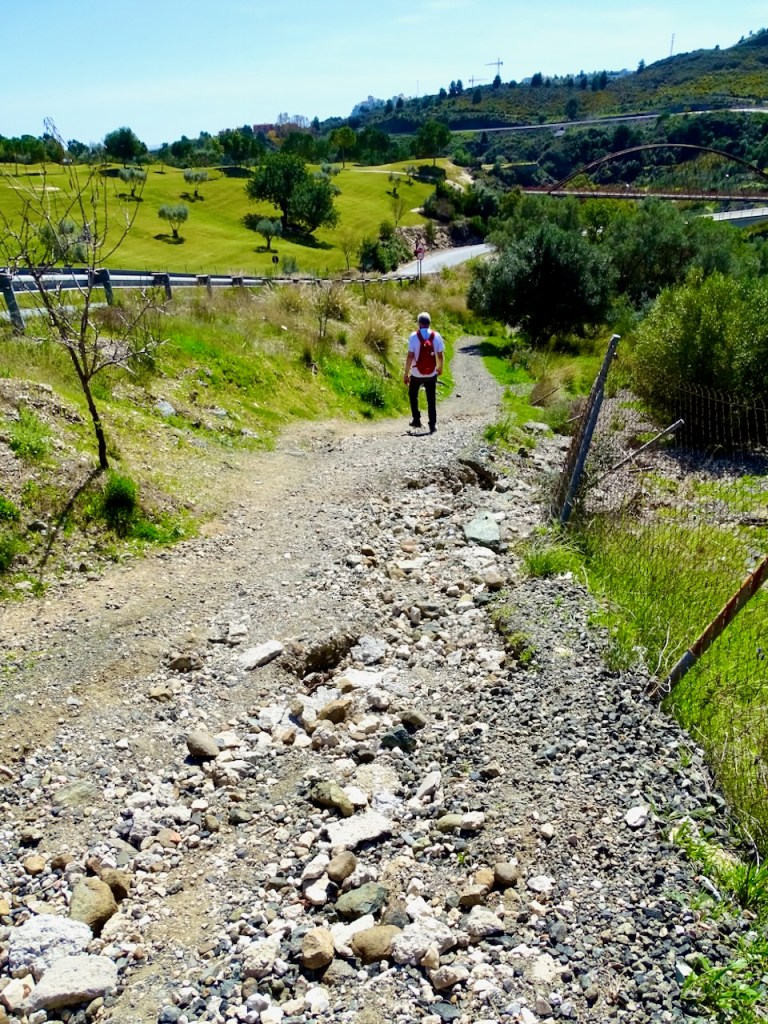 Eikä kestänyt kauan, kun olimme kohdassa, jossa voi valita, käveleekö pitemmän reitin kiertäen Guadalmina-jokea vielä alaspäin vai kääntyykö lyhyempää reittiä pohjoiseen. Me valitsimme lyhyemmän reitin kahdesta syystä. Oli niin helle, että nämä kilometrit riittivät ja toisaalta jokisuistossa saattoi olla paikkoja, joissa olisi ollut kastumisen riski.