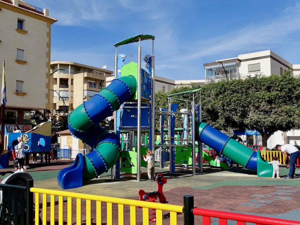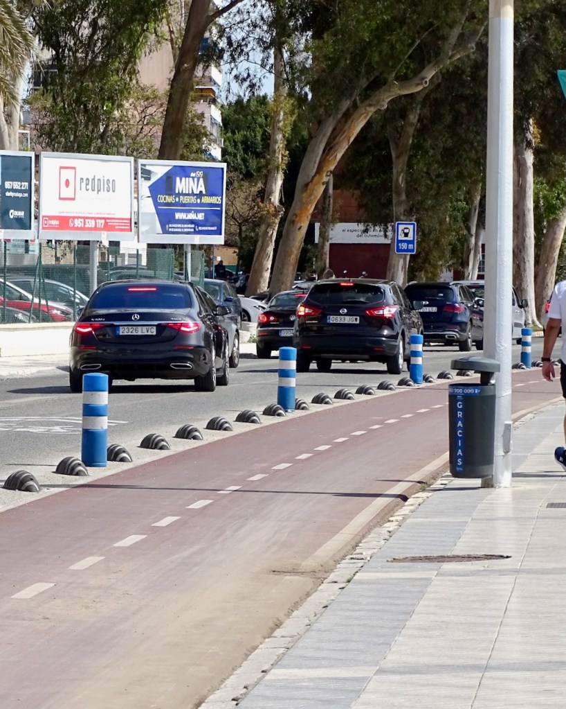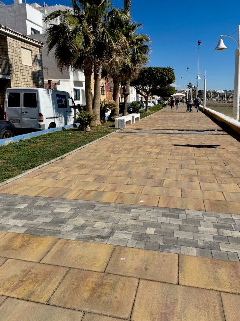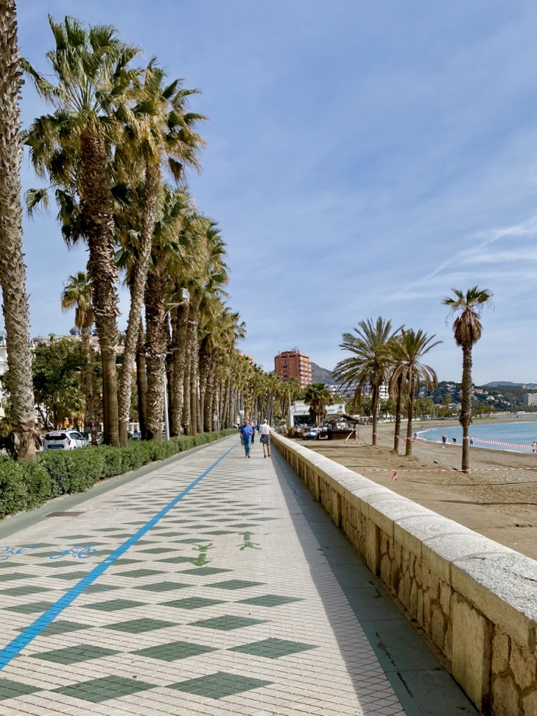 Nyt helmikuussa 2025 teimme toisenlaisen ratkaisun eri seurueella. Juha parkkeerasi auton Malagan päässä Pompidou-keskuksen viereen, käveli kanssamme jonkin matkaa ja palasi takaisin autolle. Jatkoimme tyttäreni kanssa Rincon de la Victoriaan, jonne Juha oli tuonut auton parkkiin Ayuntamiento de la Rincon de la Victorian viereiseen parkkihalliin ja lähtenyt meitä vastaa kävellen. Näin tuli kokonaismatkaa noin 12 km ja oikein hyvä!