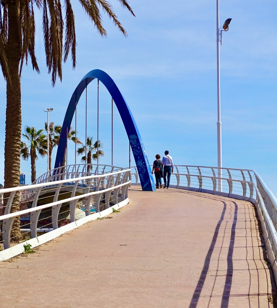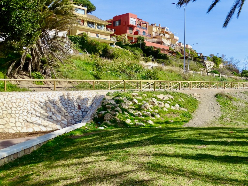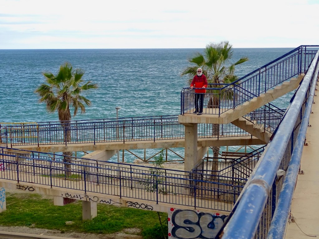 Kävelimme tätä kohtaa jo toista kertaa. Pari päivää sitten tulimme Rincon de la Victoriasta bussilla suunnilleen tänne ja käännyimme kävelemään takaisin. Silloin ylitimme tien N-340 tällaisen kävelysiltarakennelman kautta ja tulimme huomattavasi tuulisemmalle rannalle kuin tänään.