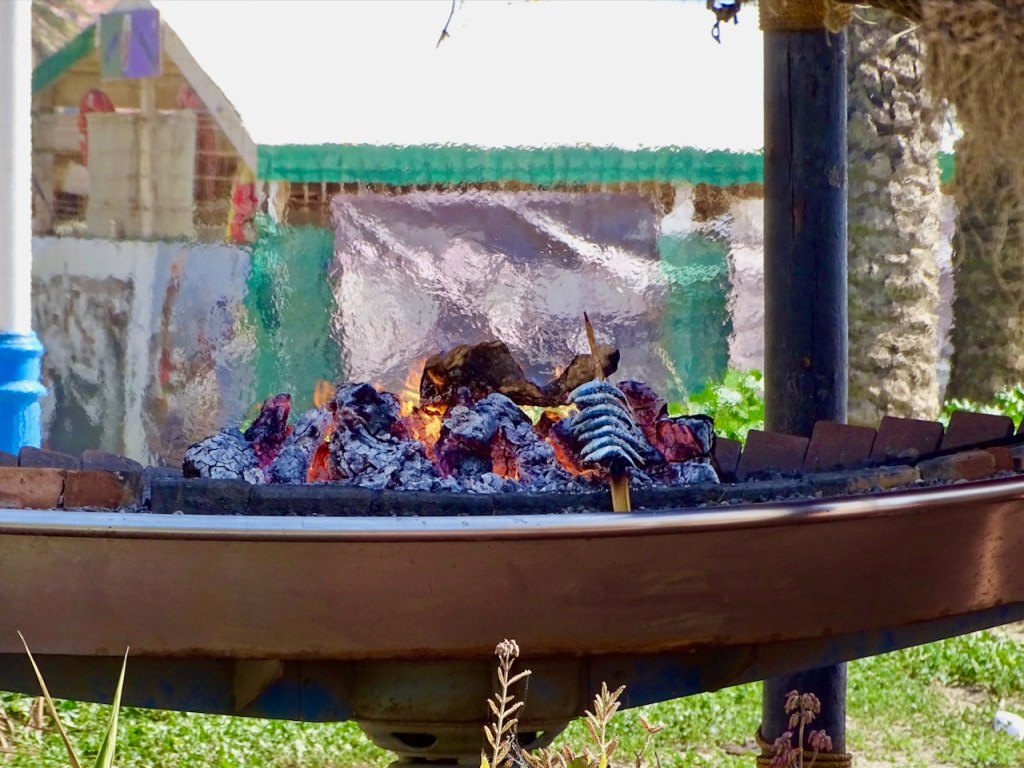 Palon rannat vasta paljon tarjosivatkin rennoille lomailijoille. Koko ranta oli täynnä ravintoloita ja terasseja, joilla hiilloksilla savustettiin kalaa. Terasseilla oli paljon ihmisiä, joten siitäkin päättelimme, että tarjonta on hyvää. Eräs espanjalainen ystävämme on tätä ravintolatarjontaa meille myös suositellut.