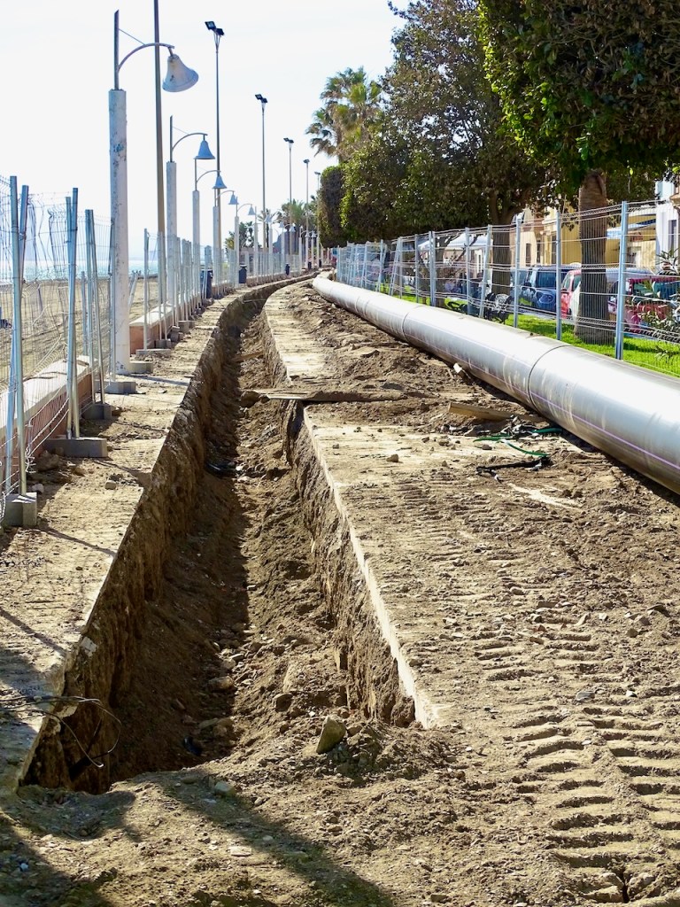 Ennen kuin saavuttiin viimeiselle hienolle pätkälle tätä reittiämme, eli Cala Moralin rannalle, saimme vielä hetken kulkea autotiellä. Aika hienolta näyttävä kävelytie oli remontissa. Tien sisälle kätkettiin jotain isoa putkea.