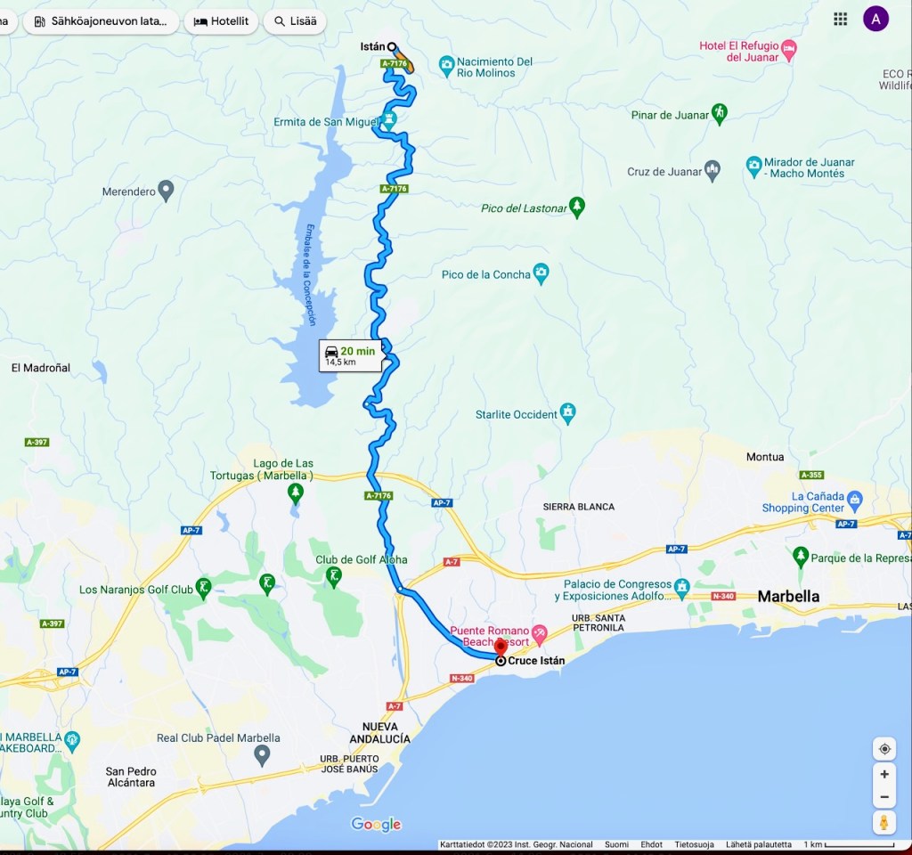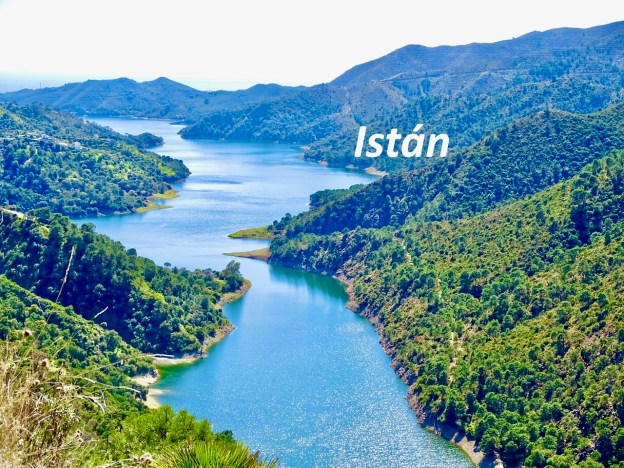 Istániin käännytään A7-tieltä Marbellan jälkeen ennen San Pedro de Alcantaraa ja Esteponaa pohjoiseen. Jo ajo sinne palkitsee maisemillaan. Hitaasti ajellen menimme mutkaisen tien ja näimme myös paljon pyöräilijöitä. Muutama pysähdys tuntui pakolliselta, järvi alkoi vilahdella tien varressa, vuoret olivat näyttäviä, eikä edes maksullisen AP7-moottoritien alituskaan ollut muuta kuin hieno näkymä.