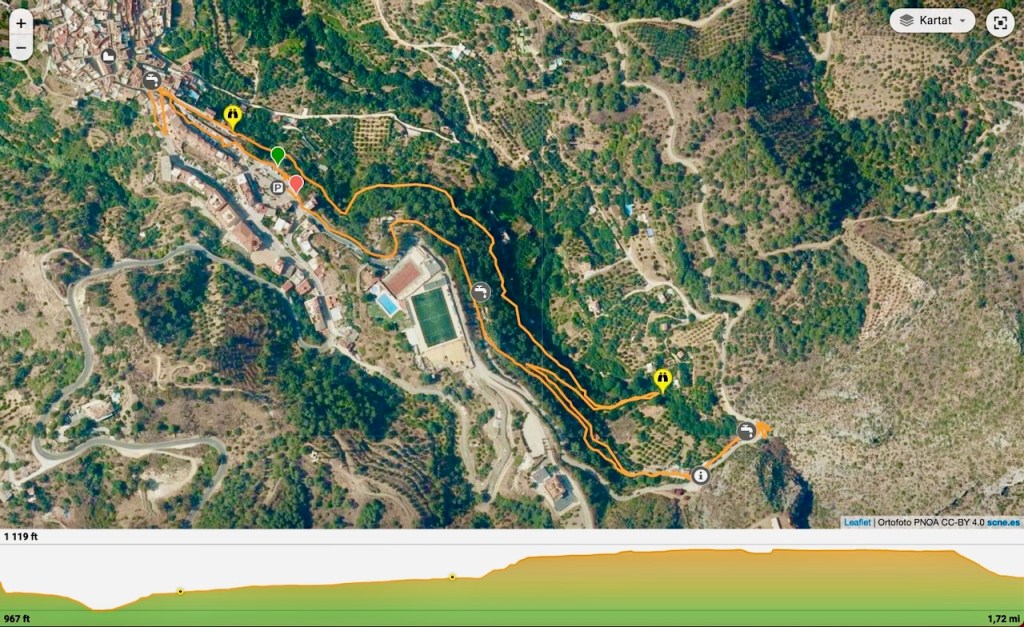 Valitsimme helpon vaellusreitin vuoren rinnettä pitkin. El Coto de Istán -nimellä löytyy. Me tallensimme sen myös Wikilociin. Tästä kuvasta näkyy, missä kiersimme ja että korkeuserot olivat vähäisiä.