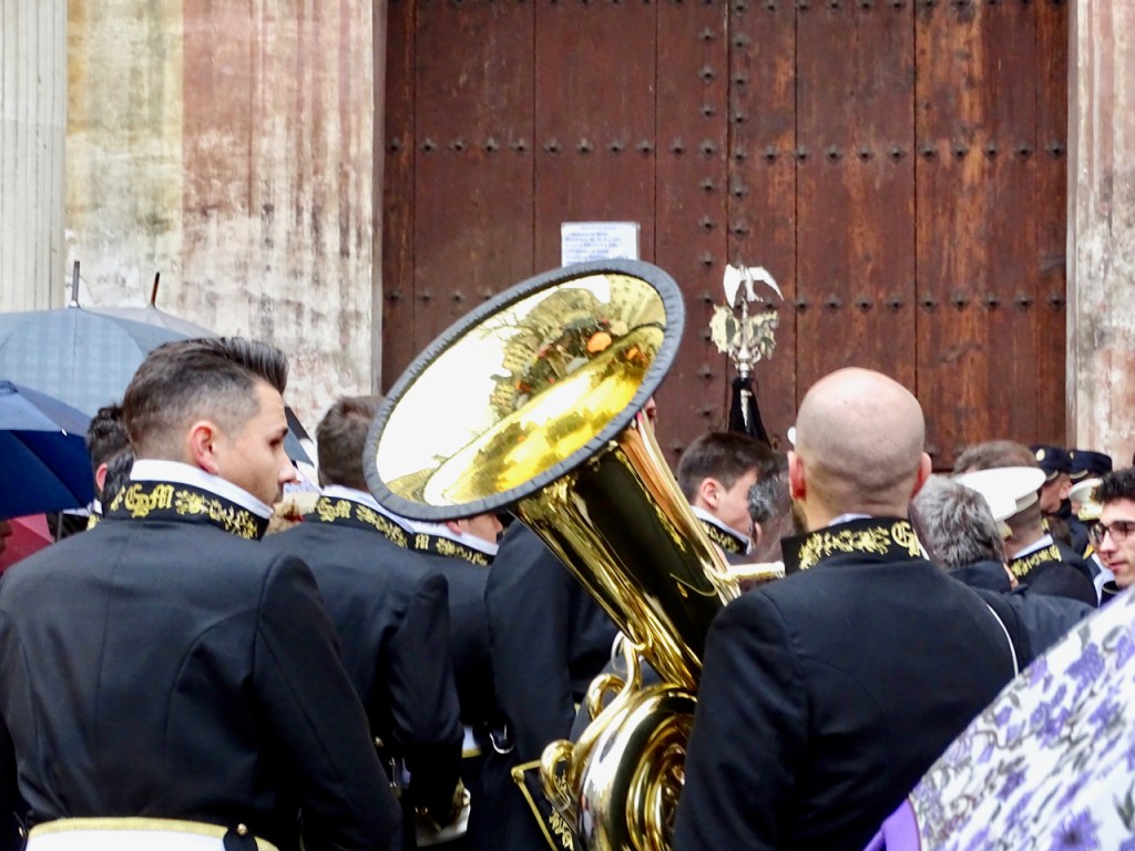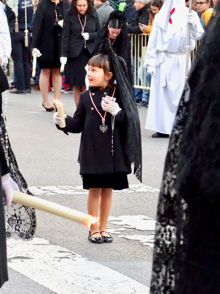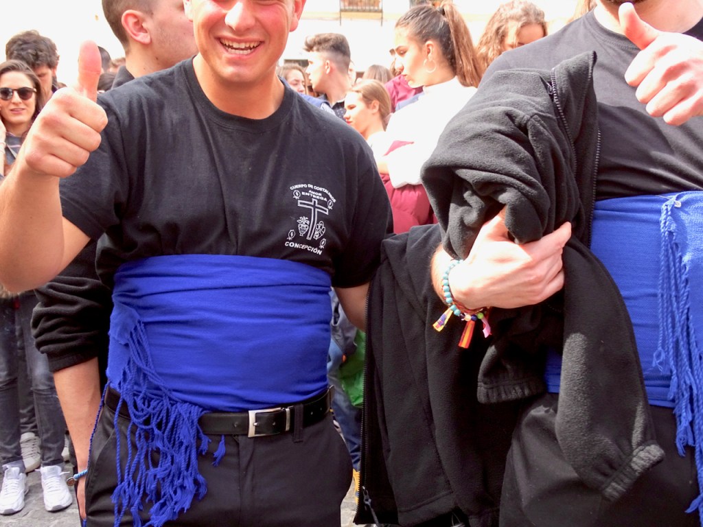 Sattui olemaan sateinen päivä, mutta siitä huolimatta sadat ihmiset odottivat kirkon edustalla kulkueen alkamista. Me muiden mukana ja samalla seurasimme kulkueen hahmojen kerääntymistä kirkkoon. Siellä oli soittokuntaa, roomalaisia sotilaita, huppupäistä kansaa ja lapsia, joita vanhemmat ja koko suku saattoi paikalle. Kaikesta näki, miten yhteisöllinen tapahtuma koko pääsiäisviikko on. Eri ikäisiä osallistujia oli valtavasti. Kulkueilla ei kaikille ole mitään uskonnollista merkitystä, monet korostavat, että ne ovat enemmänkin kulttuuriin liittyvä traditio ja nykyisin vasemmistolaiset liikkeet ovat alkaneet yhä näkyvämmin niitä myös vastustaa.