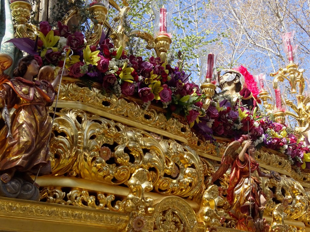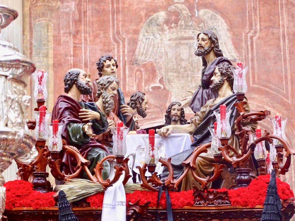 Laveteilla kannettavat patsaat sisältävät eri tapahtumia pääsiäisviikolta. Tämä veljeskunta kantoi ehtoollisen asettamista kuvaavaa asetelmaa.