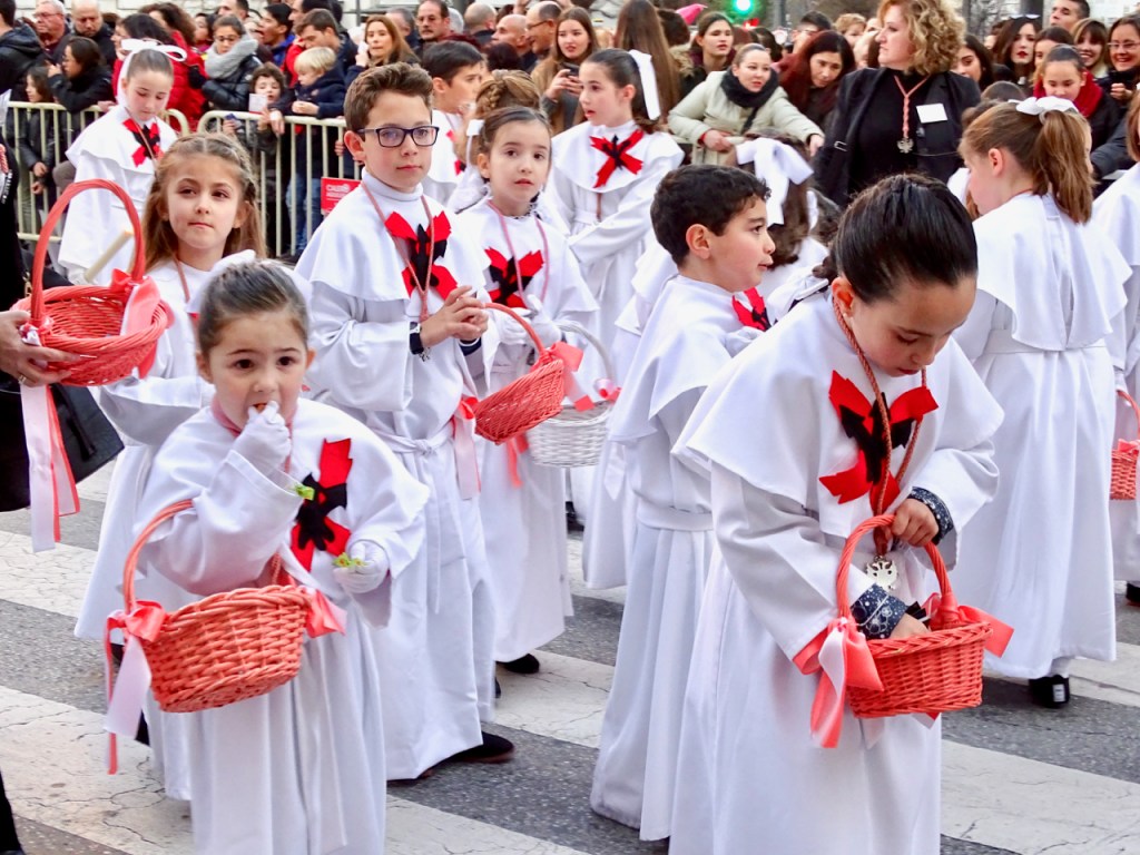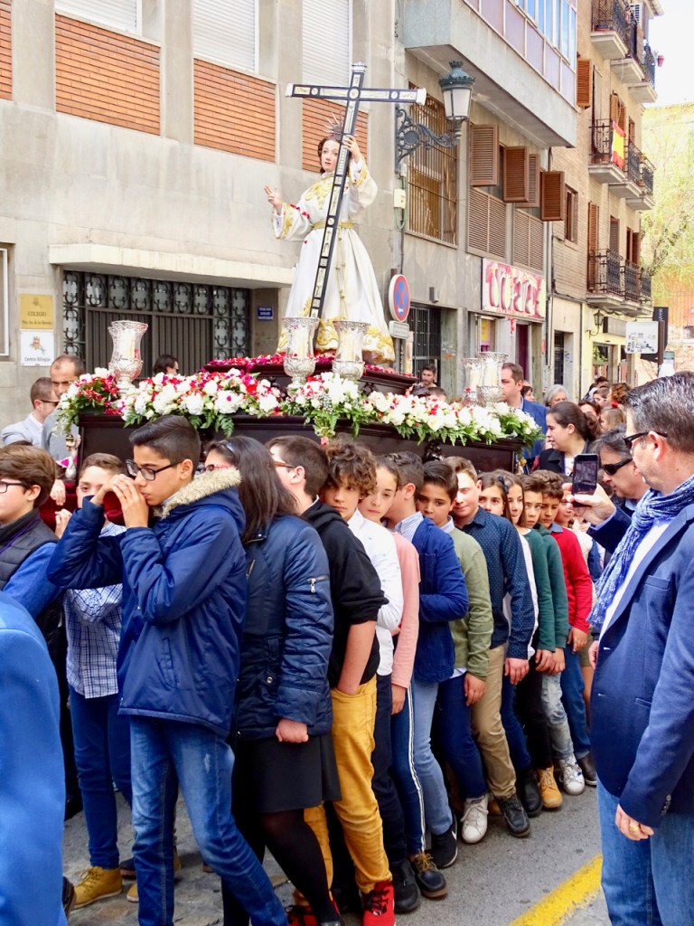 Keväisenä iltapäivänä meidät yllätti vielä lasten kulkue. Kannettava lavetti ja patsas oli kevyempi ja vaatetus rennompi. Hartaus oli hommasta kaukana, niin paljon oli omaisia vieressä ottamassa kuvaa ja videota.