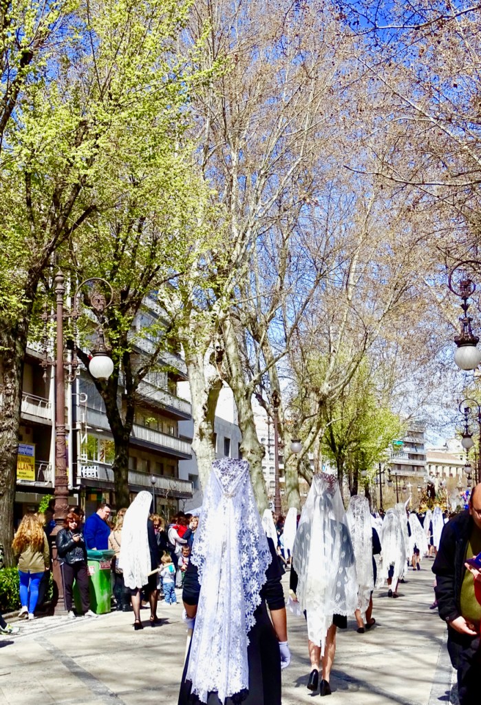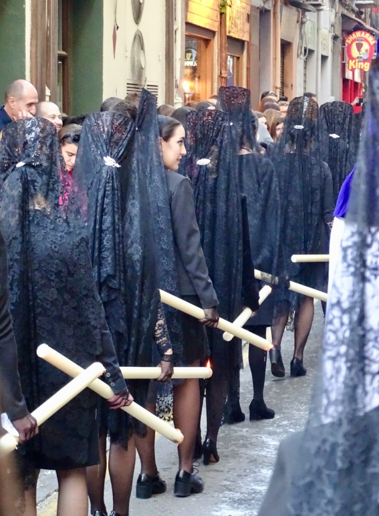 On yksi Espanjan näyttävimpiä. Palmusunnuntaina siunattiin palmunoksia, joka päivä kulkueet kulkivat pitkin katuja. Katselimme niitä katujen varsilla, kuljimme mukana, istuimme kiviaidalla monta tuntia katsellen Alhambran näkymistä lähtevää kulkuetta. Näimme kantajia, soittajia, surevia naisia ja iloisia lapsia. Yhtenä yönä valvoimme aamuyöhön, kun kotikirkkoonsa palaava kulkue ohitti kapean kotikatumme parvekkeemme alta kahden maissa aamuyöllä. Kuvia kaikesta on paljon!