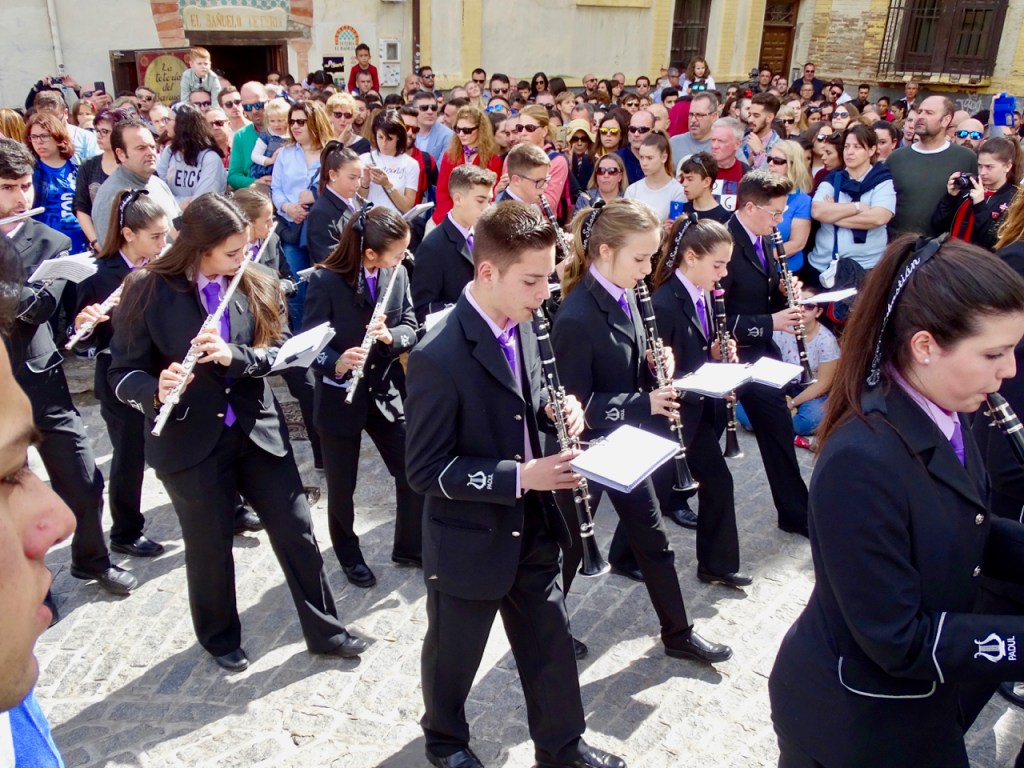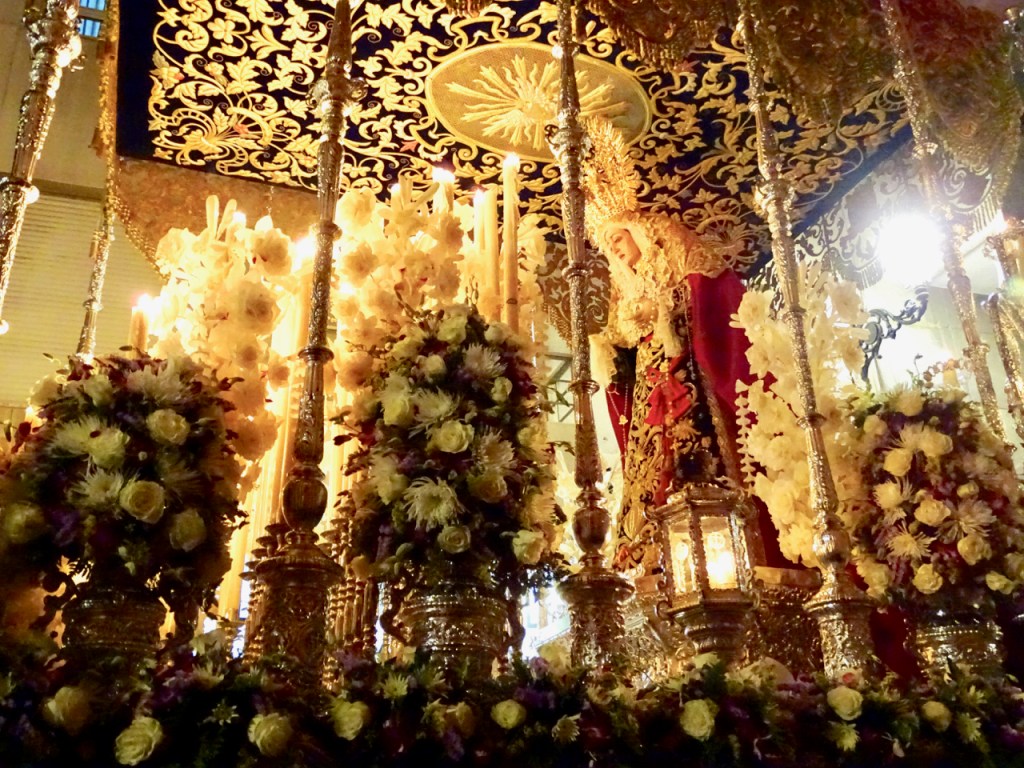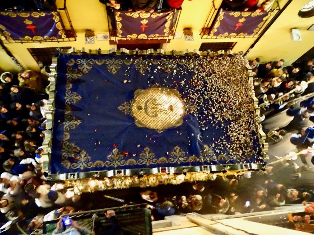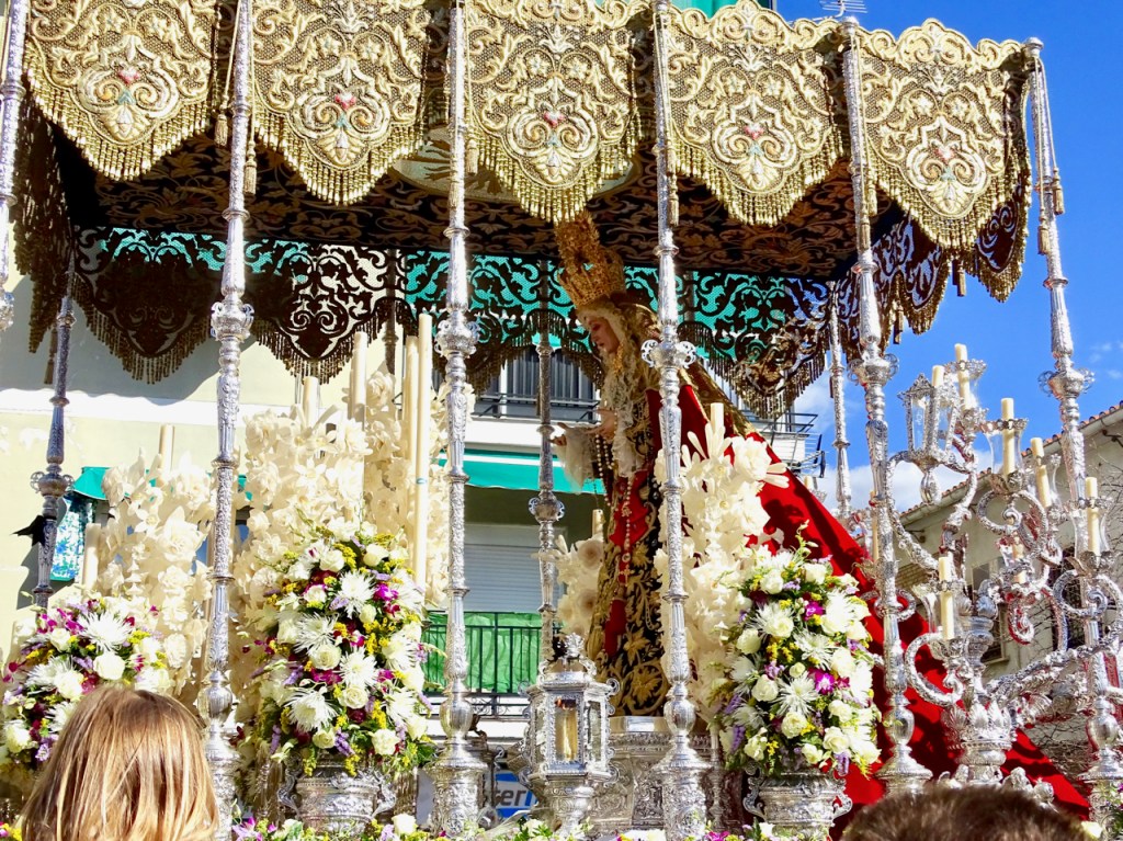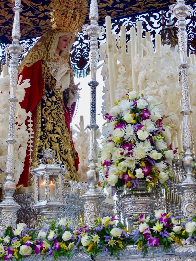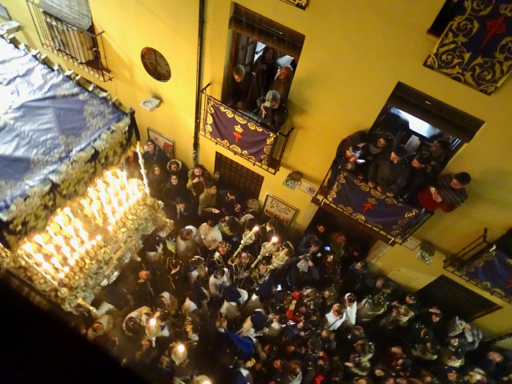 Marian tullessa näimme näytelmän, johon emme muualla olleet törmänneet. Parvekkeella meitä vastapäätä seisoi mies ja nainen ja he molemmat lauloivat arabialaistyyppisen ylistys- ja rukouslaulun Marialle ennen kuin kulkue jatkoi eteenpäin. Kysymyksessä oli ilmeisesti maurilaisperinnöstä muistuttava saeta-laulu.