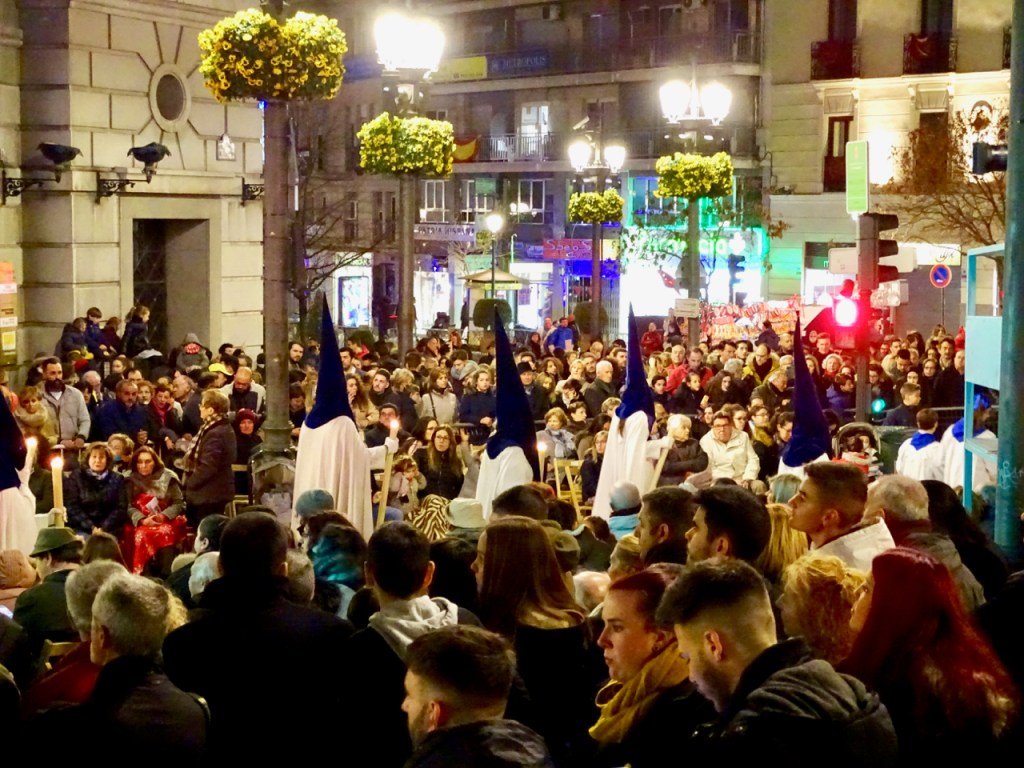 Kulkueet lähtevät eri kirkoista ja kulkevat reittiään tuntikausia. Kaikkien reitit kulkevat kuitenkin tietyn aikataulun mukaan pienen matkan samaa reittiä. Sille taipaleelle on parin korttelin verran rakennettu katsomot, joilla voi istua ja katsoa ohi kulkevia kulkueita. Näihin katsomoihin ei satunnaisella turistilla kuitenkaan ole asiaa. Niihin pitää hankkia liput jo edellisenä vuonna ja koko viikoksi. Turisti siis seisoo jalkakäytävällä niin kauan kuin jaksaa. Ja näkee halutessaan kaiken ihan vierestä.