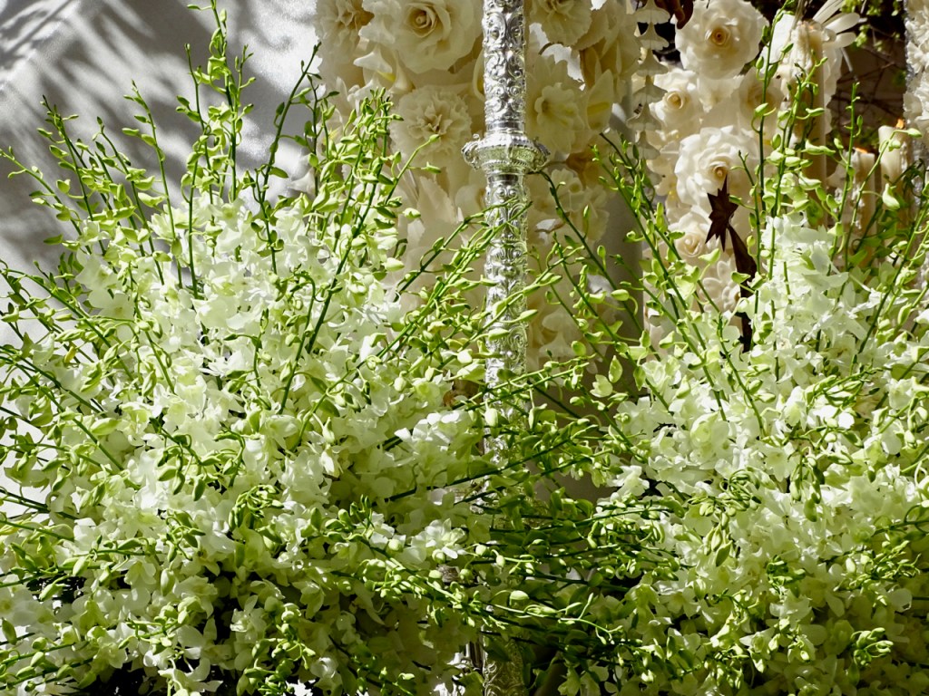 Ja sitten Marian katoksen päälle alkoi sataa tuoreita kukkien terälehtiä. Seuraavana päivänä näin kadulla, että ne olivat ruusun ja orkidean kukkia.