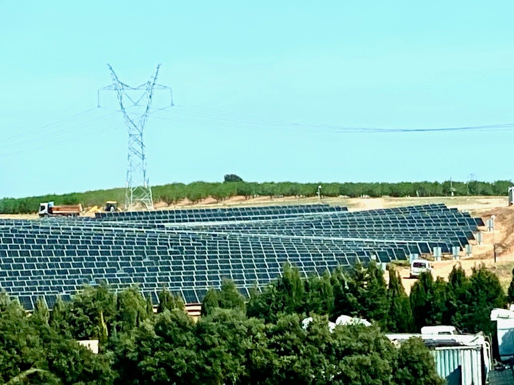 Törmäsimme myös entistä useammin maisemiin, joita hallitsivat laajat ja runsaat aurinkopaneelit. Olimme juuri lukeneet tälle seudulle sijoittuneen artikkelin siitä, miten hedelmien tuottajat jo pelkäsivät voimalaitosten ja aurinkopaneelien vähentävän hedelmätarhojen ja muun viljelyn alaa. Artikkelissa peräänkuulutettiin aurinkopaneelien sijoittamisen tarkoituksenmukaisuutta. Niitä voitaisiin asentaa alueille, jotka eivät käy hedelmien tuottamiseen. Aurinkoahan Espanjassa kyllä riittää kaikkialla.