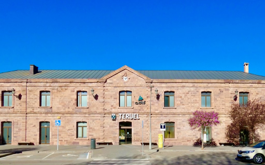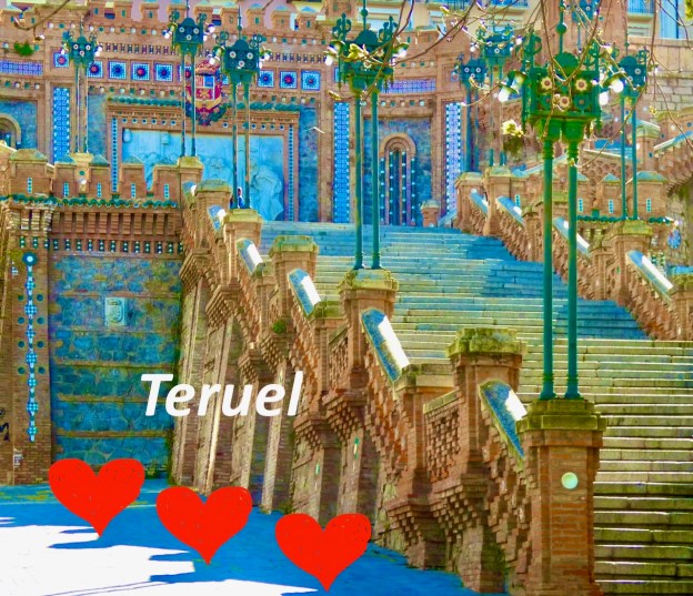 Ja sitten hakeuduimme rautatieasemalle, jonka edessä ovat Teruelin näyttävimmät portaat, jotka on rakennettu 1920-21 yhdistämään asema vanhaan kaupunkiin. Ilman portaita 26 metrin nousu olisi hankala ja portaat ovat samalla valtavan hieno nähtävyys ja myös kuvaus Teruelista rakkauden kaupunkina.
