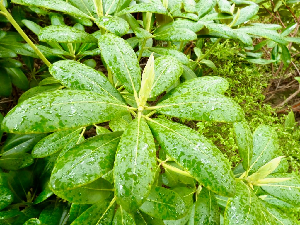 Yksi upea kävelykohde on Haagan Alppiruusupuisto. Kävimme tarkistamassa senkin tilanteen. Sadepisarat koristivat lehtiä, mutta kukat olivat vielä tiukasti nuppuja.