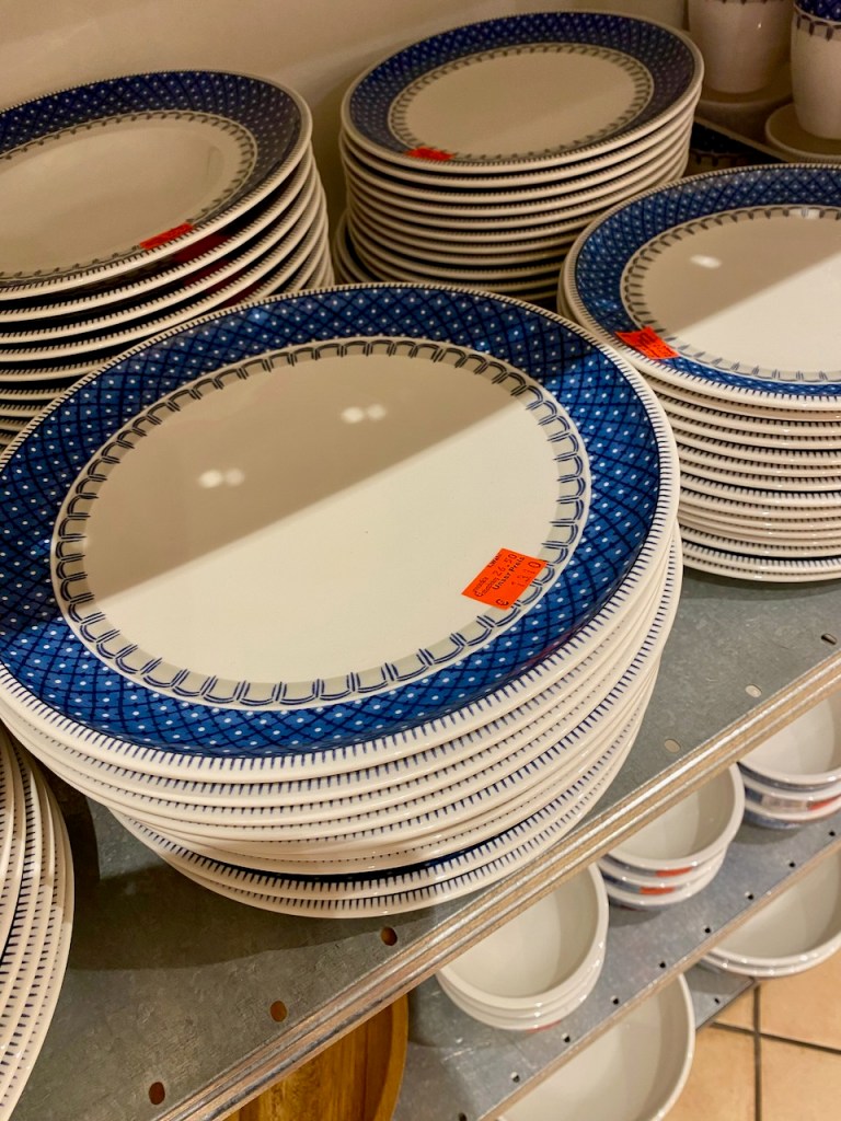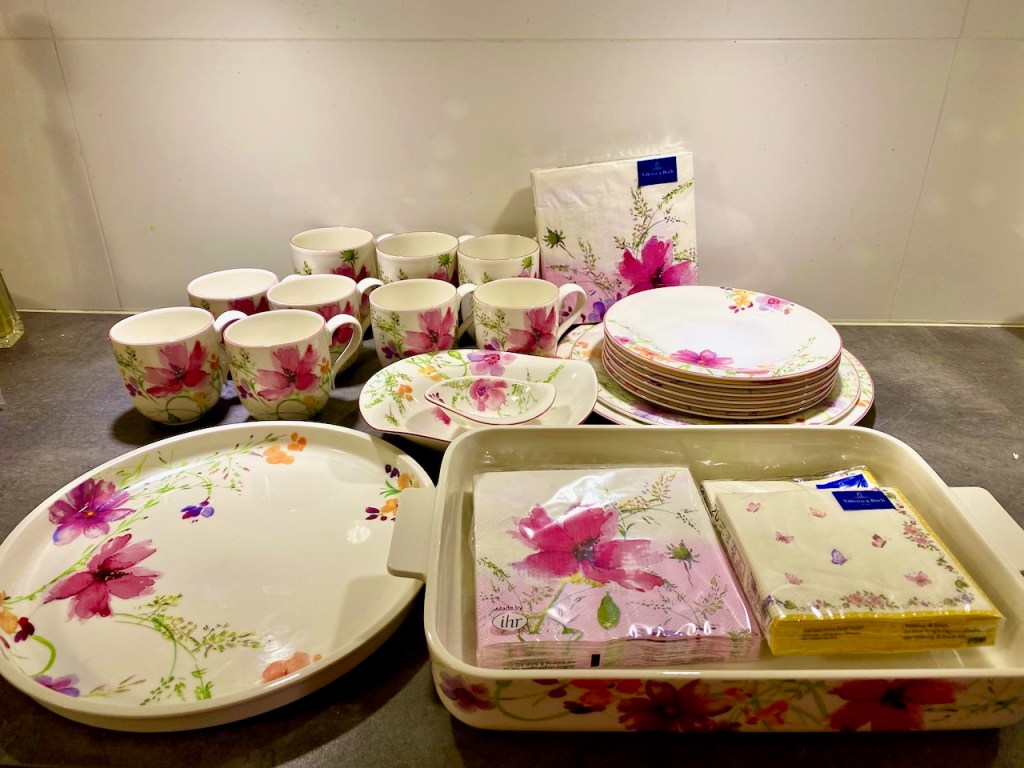 Kassa kertoi pandemia-ajan huonontaneen valikoimaa ja tarjontaa. Samalta näytti meistäkin. Ei ollut enää näitä hullunhalpoja hyllyjä ja muutenkin valikoimaa oli vähän huonommin. Ei kuitenkaan huonosti, kyllähän tämä tehdas edelleen laadukas ja suosittu valmistaja on. Jos meillä olisi ollut tarvetta hankkia jotain, olisi kyllä löytynyt, mutta kun ei ole enää, ja lastemme perheilläkin on jo kaikki tarpeellinen, paljon täältä tuotua. Sen sijaan kärryyn valikoitui sellaista, mitä emme voineet vastustaa. Yksi näistä on Mariefleur, jonka ihania mukeja ja lautasia olemme käyttäneet jo vuosia. Tarjolla oli alle puolen hinnan tarjotin ja uunivuoka, eli noin 25€/kpl. Nostin kuvaan niiden kanssa jo aikaisemmatkin ostoksemme. Myös lautasliinavalikoimat täydensimme jälleen kerran.