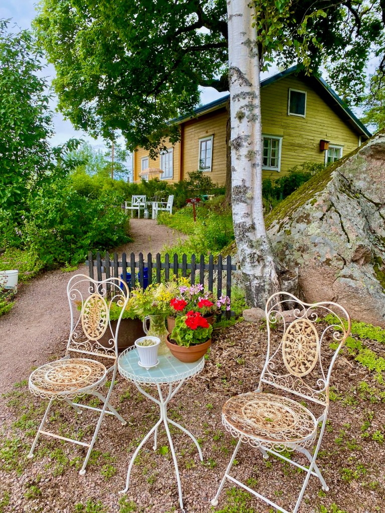 Pitkin puutarhaa on istumaan houkuttelevia paikkoja. Tervetuloa piknikille luonnon helmaan!