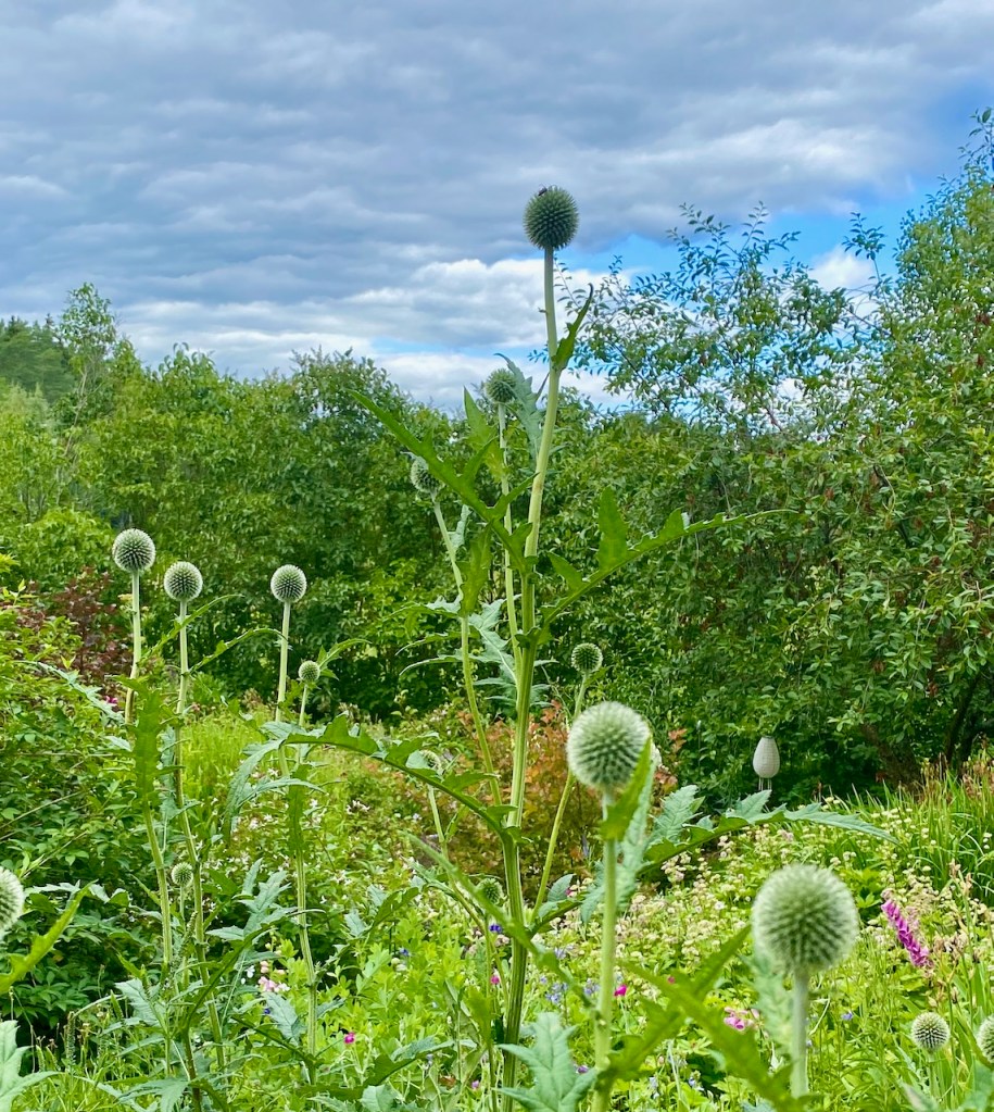 Viimeinen käyntikohteemme oli myös Pernajantien varrella eli Villa Saarni. Puutarha ei ole valtavan laaja, mutta siellä on erittäin runsas ja kaunis perennojen, pensaiden ja puiden valikoima. Näimme täällä myös ainakin kolme sellaista kasvia, joita emme ole tienneet olevan olemassakaan. Riippalehtikuusi, kirjosaarnivaahtera ja valkopallo-ohdake. Tunnistaisitko sinä nämä?