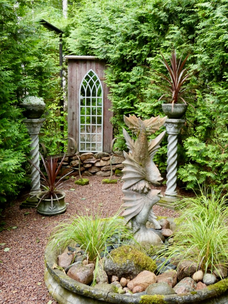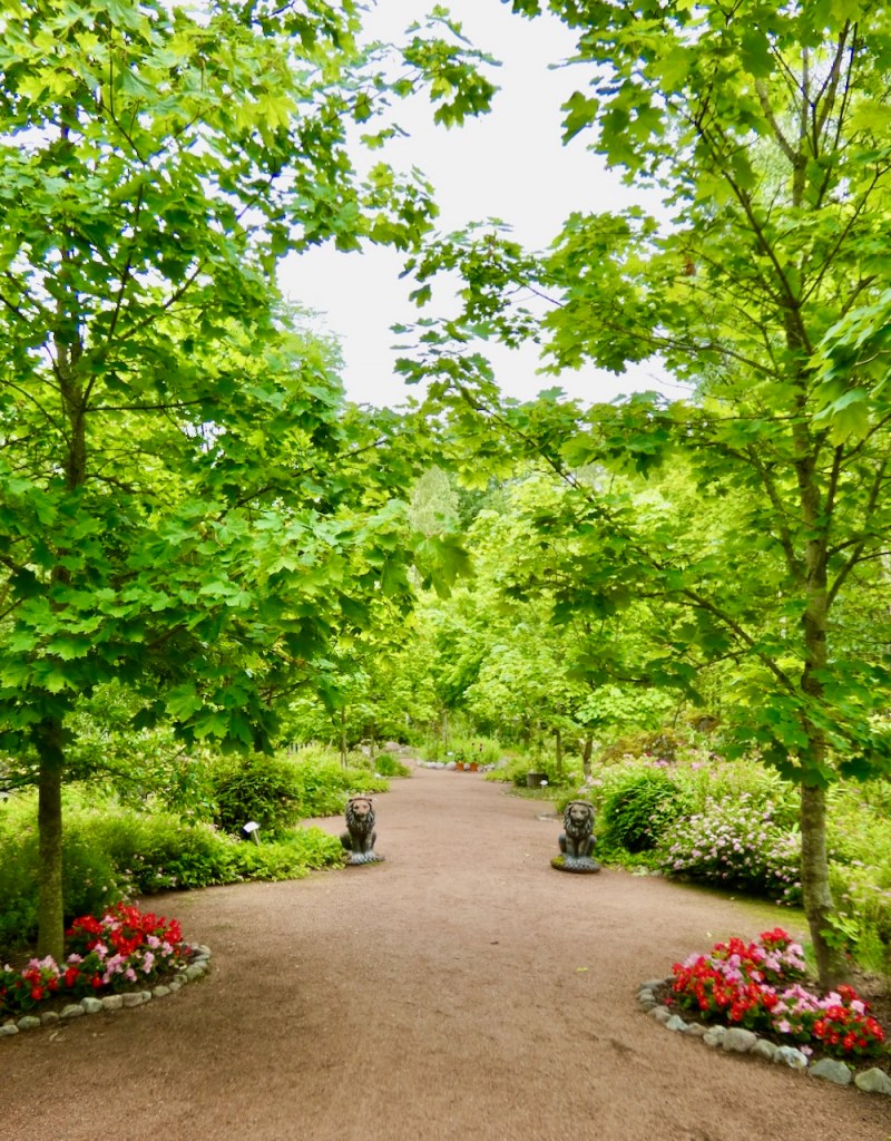 Esittelytekstissä sanottiin, että polkujen mutkien takana on aina yllättäviä näkymiä ja niin olikin. Oli sekä istutuksia että rakennuksia ja niitä esineitä.