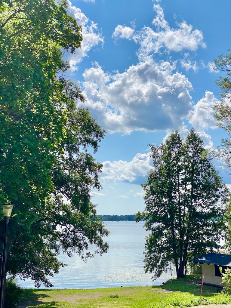 Järvenpään rannalla on iso hieno puisto. On leikkipaikkoja, ja kahvia ja jäätelöä voi ostaa myös. Meillä on tapana istahtaa tämän pöydän ääreen nauttimaan omia eväitä. Nyt en pysähtynyt, otin vain kuvan aamun tyynestä järvestä. Läsnä olivat kyllä vahvat muistot yhteisistä retkistä.