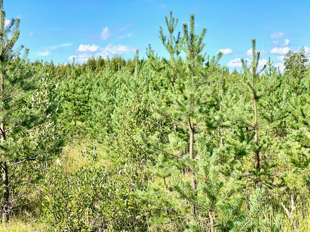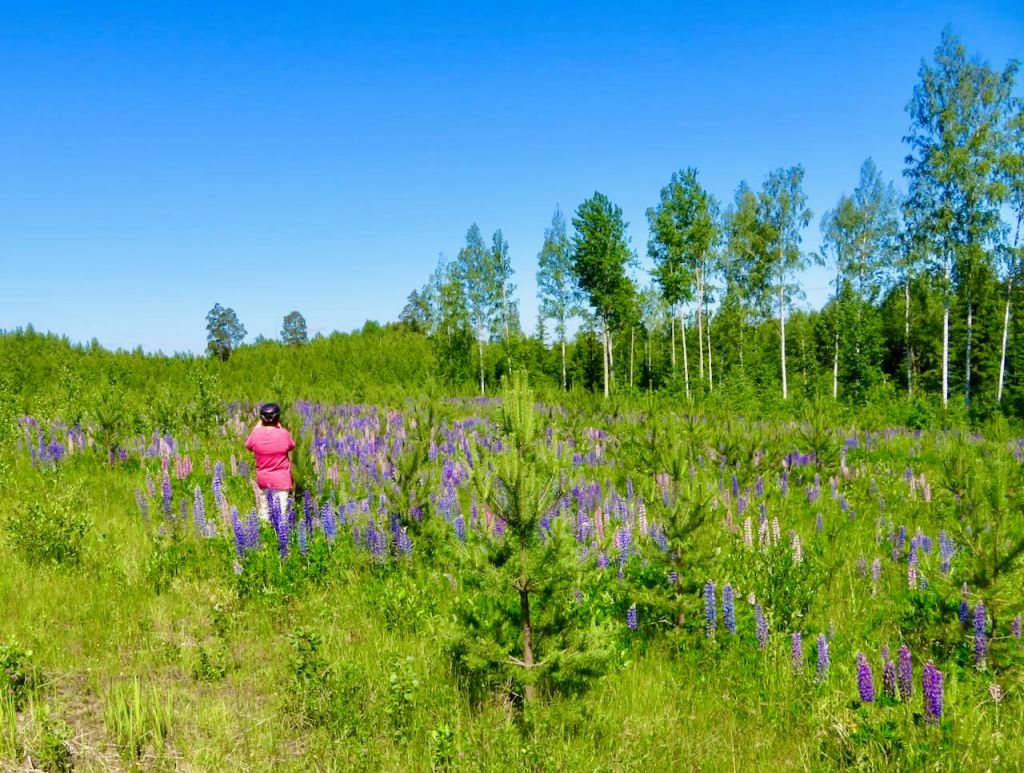 Talutimme, koska katselimme ihmetellen, miten nopeasti metsä kasvaa. Ensimmäinen kuva on vuodelta 2020, jolloin männyntaimet olivat pienempiä kuin ympäröivät lupiinit.