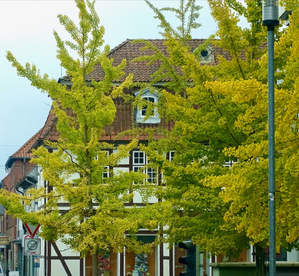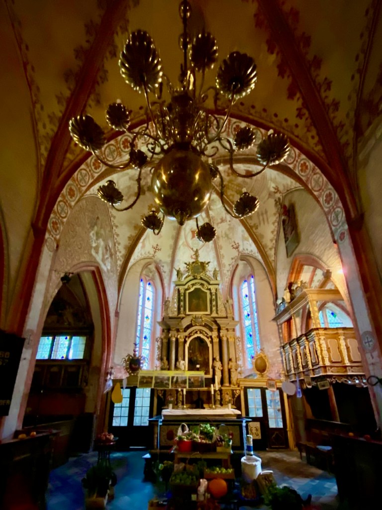 Kalkhorstissa on muutakin hienoa nähtävää. Parkkeerasimme kirkon viereen ja näimme, että ovi oli auki, ja vieressä puuhasi nainen istutusten parissa. Hän toivotti meidät tervetulleeksi ja sanoi, että voisimme ottaa mukaamme siitä mitä tahansa istutuksia ruukuissa. Yhdessä sitten naureskeltiin, että Suomeen on turhan pitkä matka lähteä niitä kuljettamaan ja etenimme sisälle. Siellä oli muutamia miehiä korjaamassa pois sadonkorjuun kiitosjumalanpalveluksen rakennelmia ja hekin toivottivat meidät tervetulleiksi ja laittoivat vielä valotkin palamaan, että näimme paremmin. Ystävällinen kokemus.