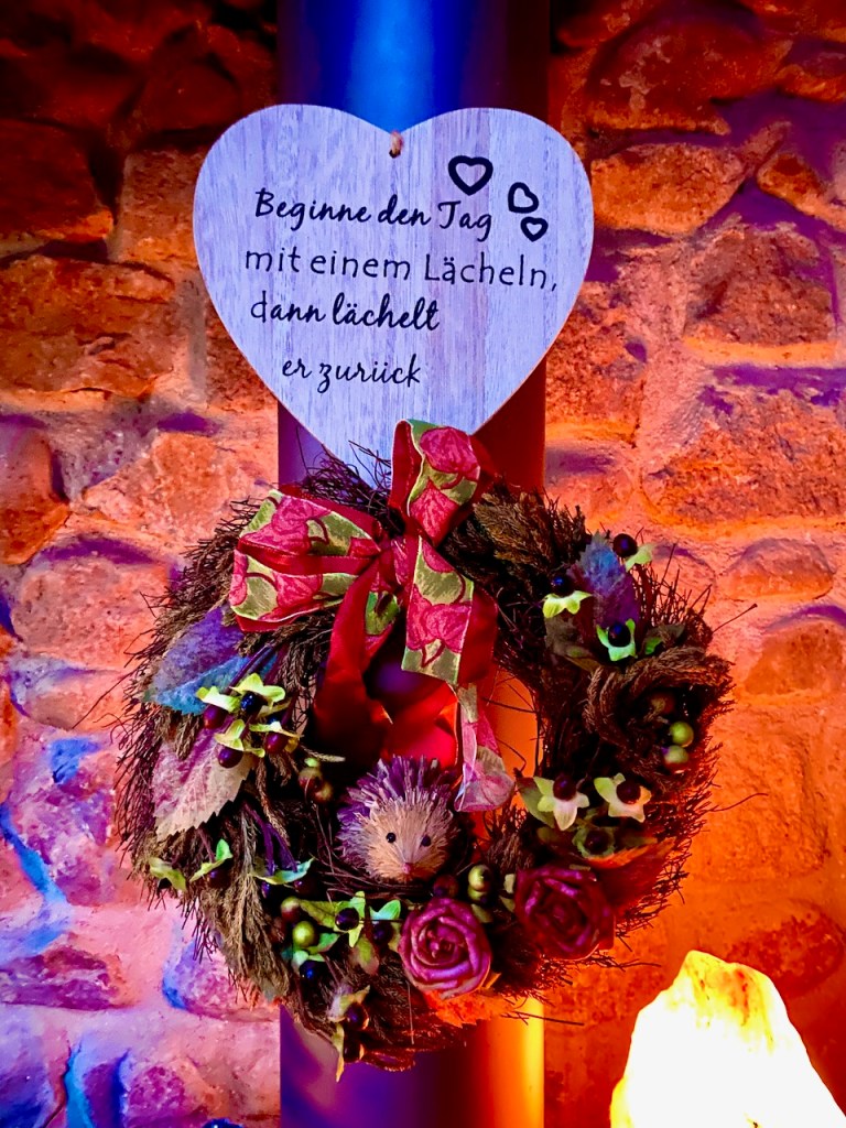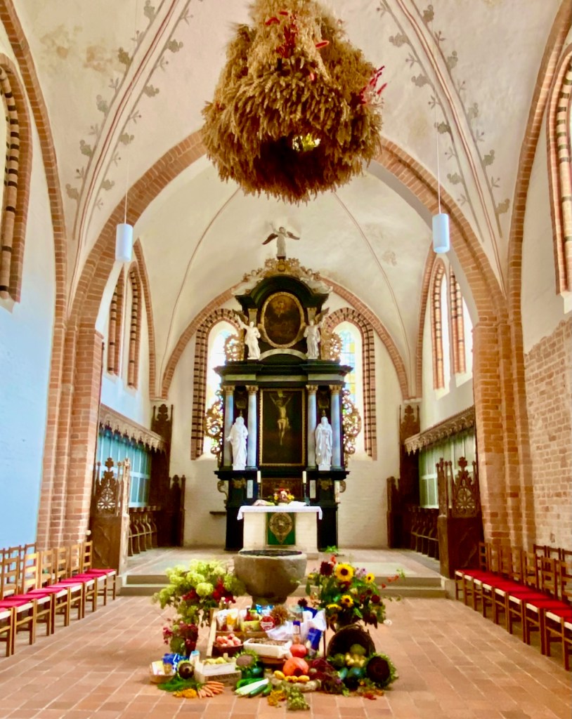Sunnuntaiaamuksi etsimme lähiseudulta ”Evangelische Gottesdienst” ja se löytyi Boltenhagenista. Paikka oli sopivan noin 8 kilometrin pyöräreitin päässä, joten sinne! Kirkko oli tosi täynnä ja sen mäellä oli paljon pyöriä, eli samalla tavalla oli moni muukin tullut. Alttarilla oli syksyn sadonkorjuun kiitokseksi tuotuja hedelmiä ja muuta satoa.