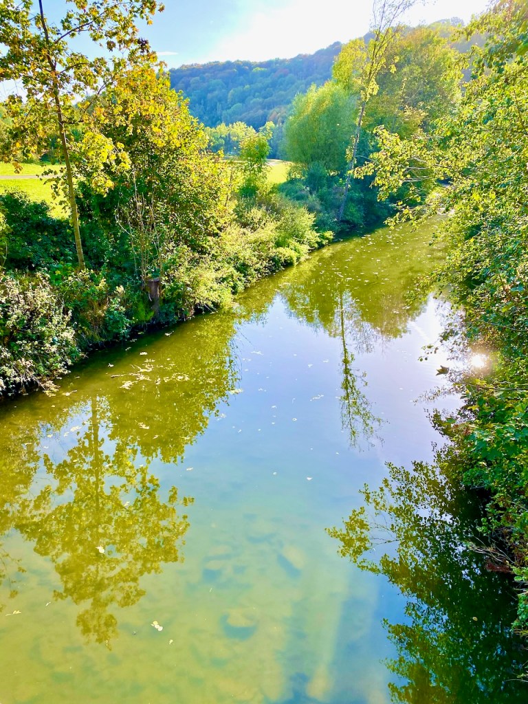 Täältä katselimme vastakkaisesta suunnasta samoja rinteitä, joita edellisenä päivänä olimme katselleet pyöräillessämme alhaalta jokirannasta. Täältä näkyi myös se Dobbelbrücke.