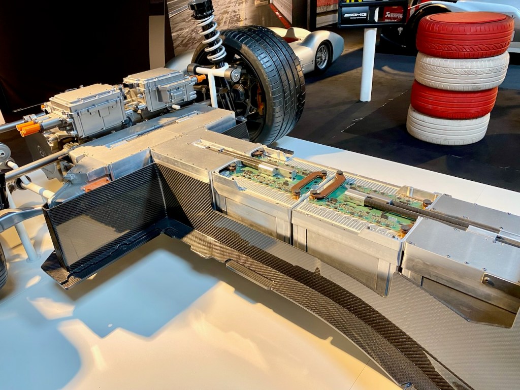 Museo ei ollut ihan täynnä pelkkää vanhaa autoaineistoa. Oli siellä uuttakin. Mercedeksen sähköauton patteriverkostoa ja Sähkö-Mersu ilman peittoa.