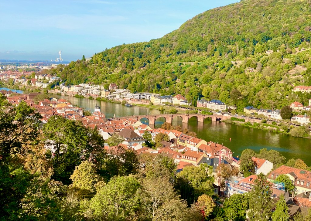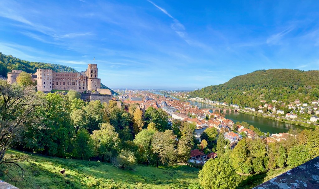 Vihreitä metsiä ja niiden ruskaa vasten kohoavat punaiset hiekkakivirauniot näkyvät upeina Neckar-joen laaksoon. Linnan siluetti hallitsee Heidelbergin vanhan kaupungin keskustaa.
