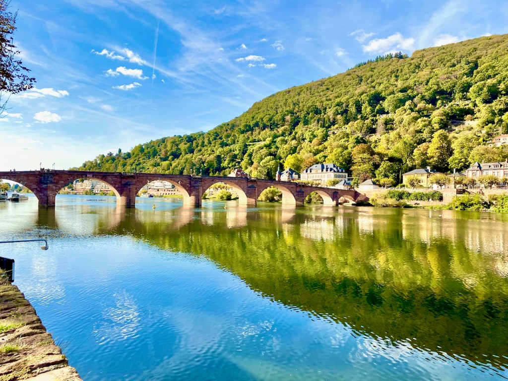 Heidelbergin linna, Neckarin jokimaisemat ja joen ylittävä silta – näistä näkemämme kuvat houkuttelivat meidät Heidelbergiin. Ihan oikeat houkuttimet! Heidelbergin linnan esittelysivuilla sanotaan, että siellä käy vuosittain miljoona ihmistä. Ihmettelemme ja emme. Linna on varsinkin näköaloiltaan hieno käyntikohde, mutta ei siellä minkäänlaista ruuhkaa näkynyt. Sillan katselimme sekä ylhäältä rinteeltä että vierestä ja jokimaisemissa teimme oikein hyvän pyöräilylenkin kauniissa säässä.