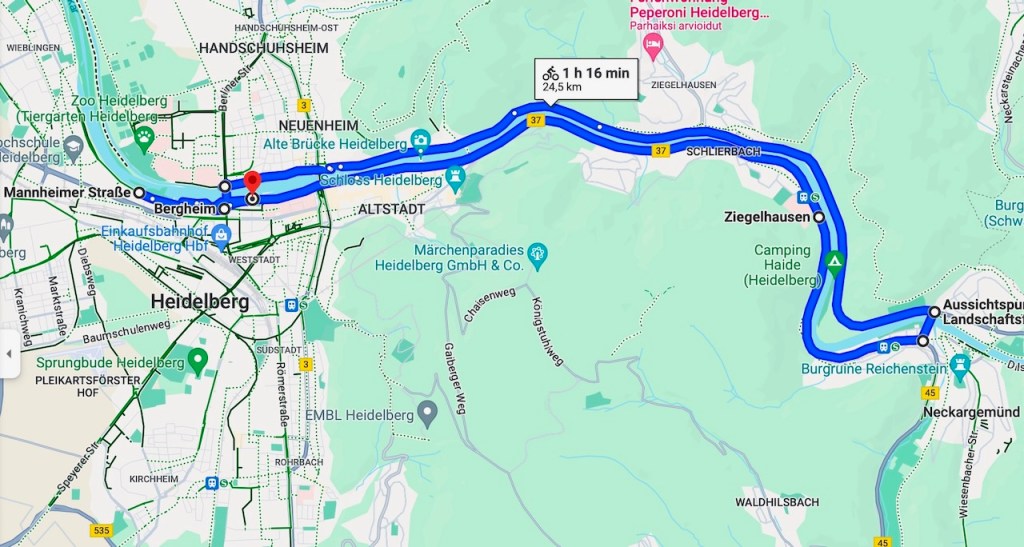 Tässä vielä kartta Heidelbergin ja Neckargemundin välisestä pyöräretkestämme.