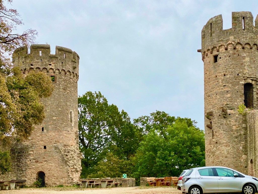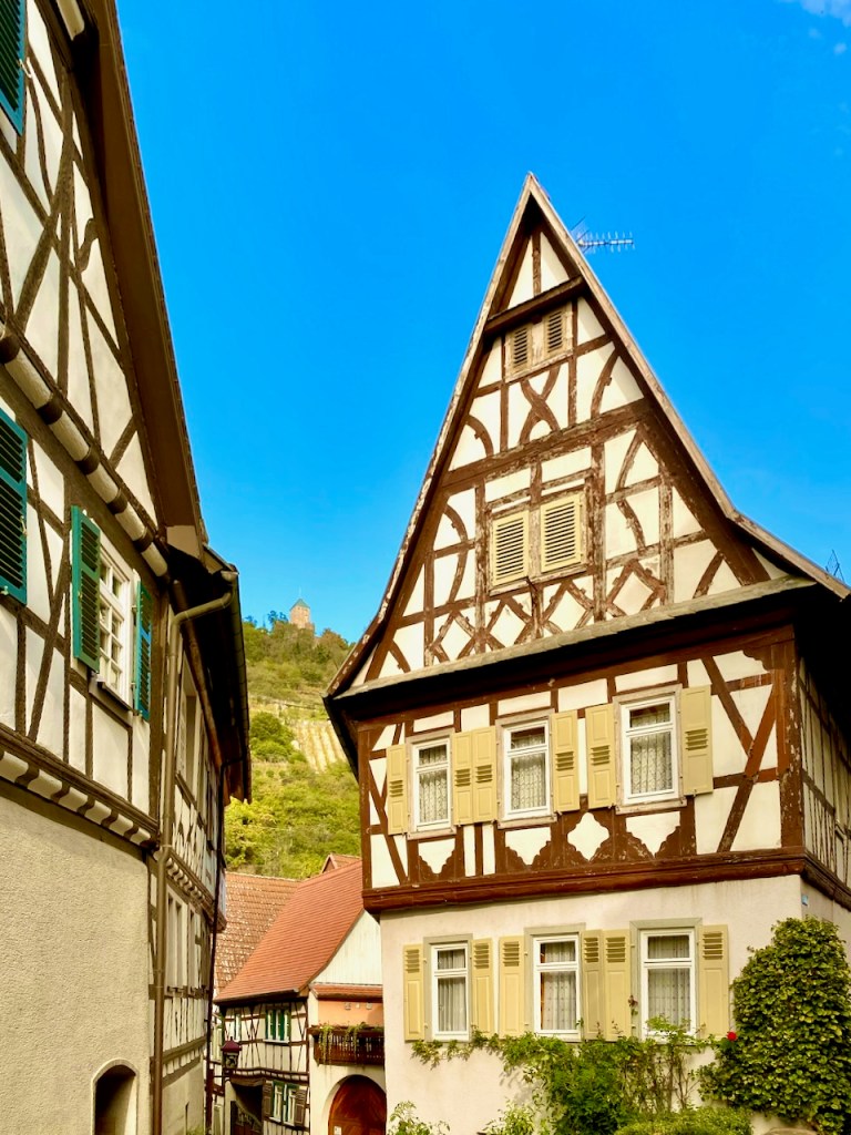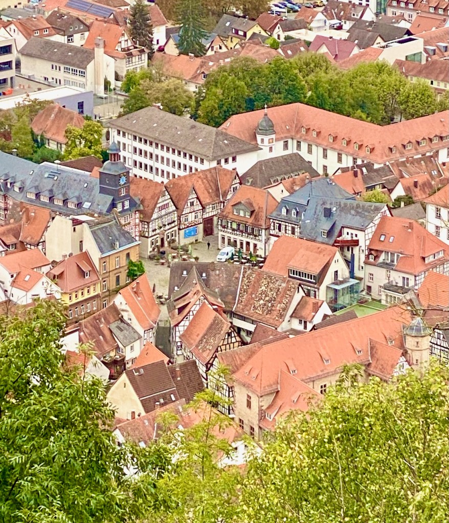 Aloitimme ajamalla Burg Starkenburgille. Sinne oli hyvä viitoitus, vaikka olikin kapea tie niin kuin aina. Viimeisen lyhyen rinteen kävelimme. Jo kävellen noustulta rinteeltä oli hienot näkymät sekä kaupunkiin että sille Marktplatzille jolla ovat ne näyttävimmät ristikkotalot ja terassit.