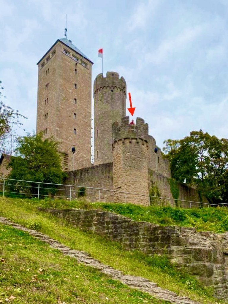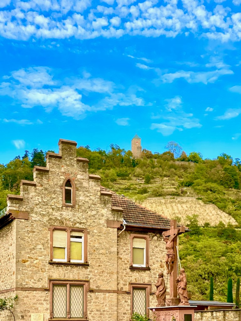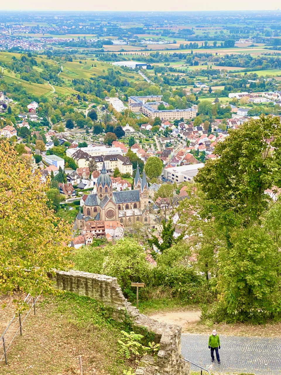 Kirkon pihalta ylöspäin kurkistaessamme näimme rinteellä Starkenburgin linnan, josta olimme Heppenheimin vierailumme aloittaneet.