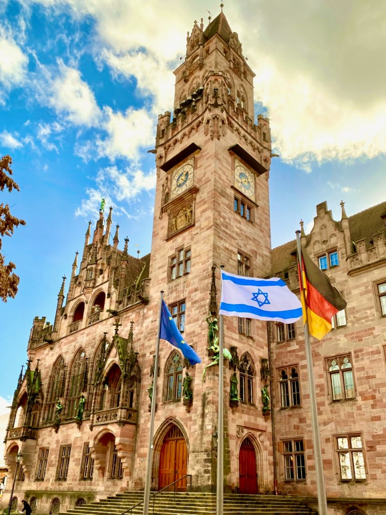 Raatihuoneen edessä liehui Israelinkin lippu – ilmeisesti senhetkisen kriisitilanteen takia erittäin perusteltua ja näyttää myötätuntoa.