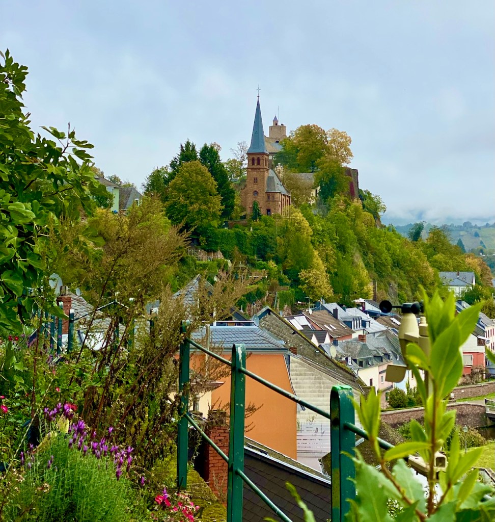 Saarburgiin saavuttuamme sumu alkoi kuitenkin hälvetä ja lähdimme kävelemään sitä kaikkien mainostamaa keskellä kaupunkia olevaa putousta kohti. Matkan varrella olleen kirkon terassilta näimme, että edessä olisi muutakin nähtävää. Torni mäellä näytti oikein hyvältä.