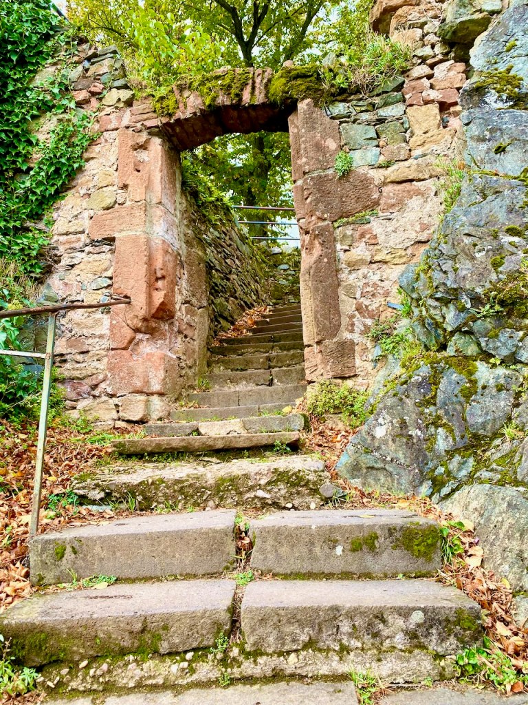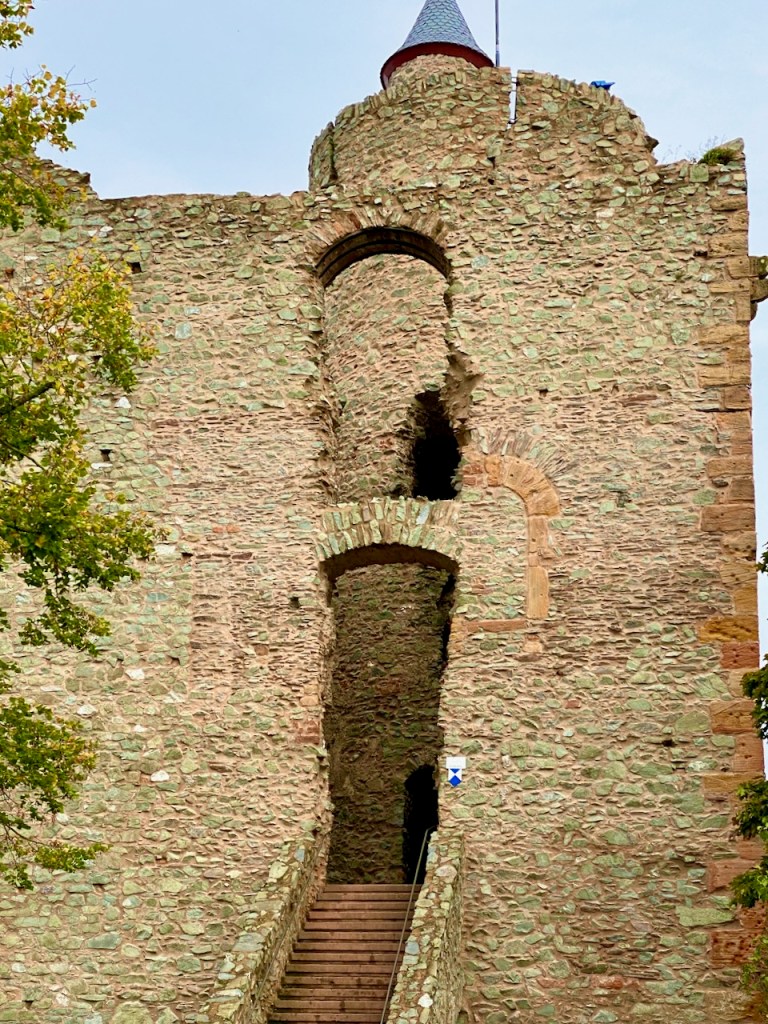 Linnan historia ulottuu 900-luvulle ja se on yksi läntisen Saksan vanhimpia. Linnan pihalla oli kaunista kasvillisuutta ja portaat houkuttelivat etenemään ylöspäin. Pääsymaksua ylöspäin ei ollut, mutta Juhaa houkuttivat pihan leppoisat penkit enemmän, eikä mikään ihme, portaitten lähellä oli niitä mukavasti, mutta minä sitten etenin.
