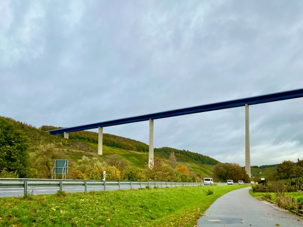 Ennen riippusiltaa katsoimme vielä Moselin rannalta sen ylittävää korkeinta moottoritiesiltaa eli Hochmoselbrückeä Zeltingen-Rachtigin kohdalla. Tästä siis tuli siltapäivä.