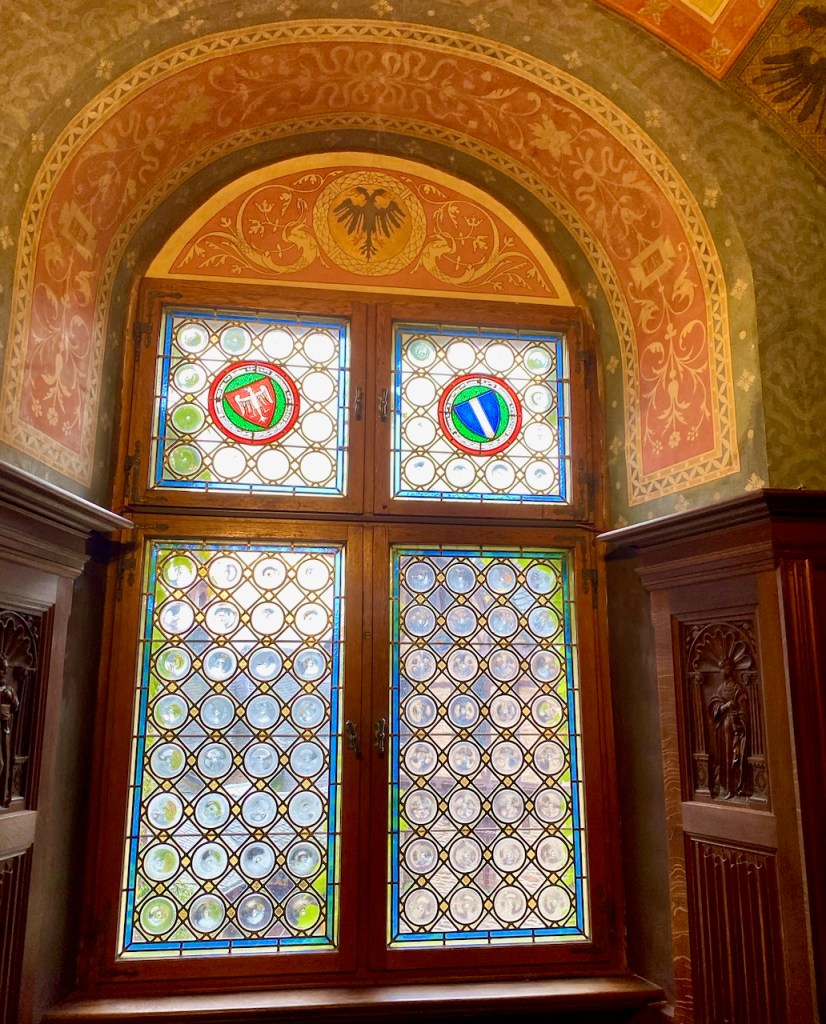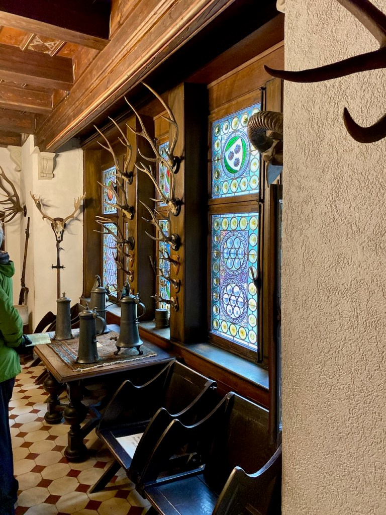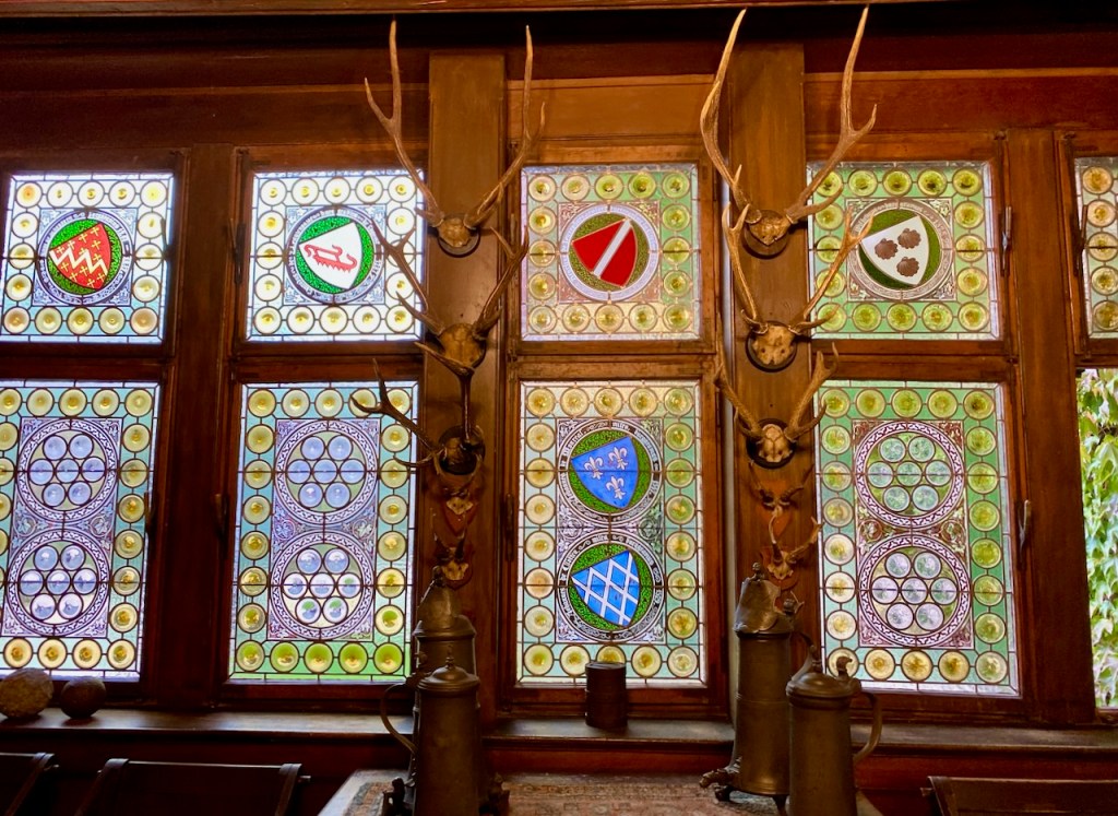 Metsästäjän huoneessa on myös ikkunoita, jotka on tehty ”pullonpohja lasi” -tekniikalla. Niihin on kuvattu omistajien vaakunoita.